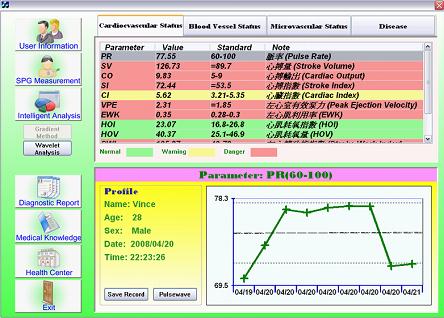 該系統結合軟硬件,讓用戶在家裡通過單機或聯網進行自我檢測心血管的健康狀況;並透過無創採集手腕橈動脈處的脈搏波,利用小波分析、向量支撐機、血流動力學等技術對脈搏波進行處理和分析,再經人工智能及電腦心血管專家輔助診斷技術進行推理診斷,從而快速得知人體心血管系統的健康狀況,向客戶發出相關疾病的報警提示信息;並能顯示長期的心血管健康指數曲線,讓用戶瞭解自身心血管系統的健康趨勢,以便有針對性地採取養生保健的對策。