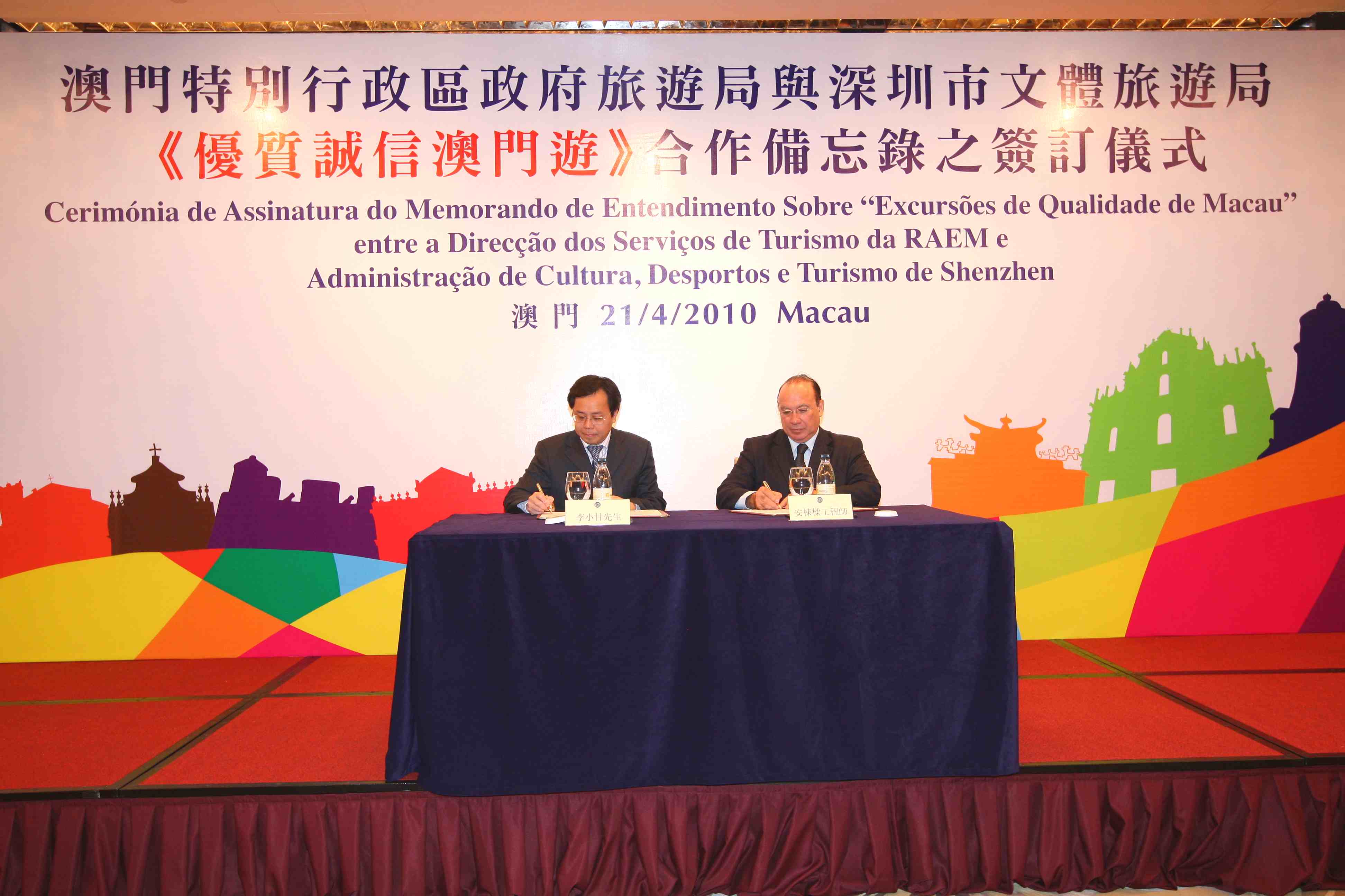 澳門特別行政區政府旅遊局今(21日)與深圳市文體旅遊局簽署“優質誠信澳門遊”合作備忘錄,希望深澳兩地旅遊業能健康發展及維護澳門遊市場秩序。