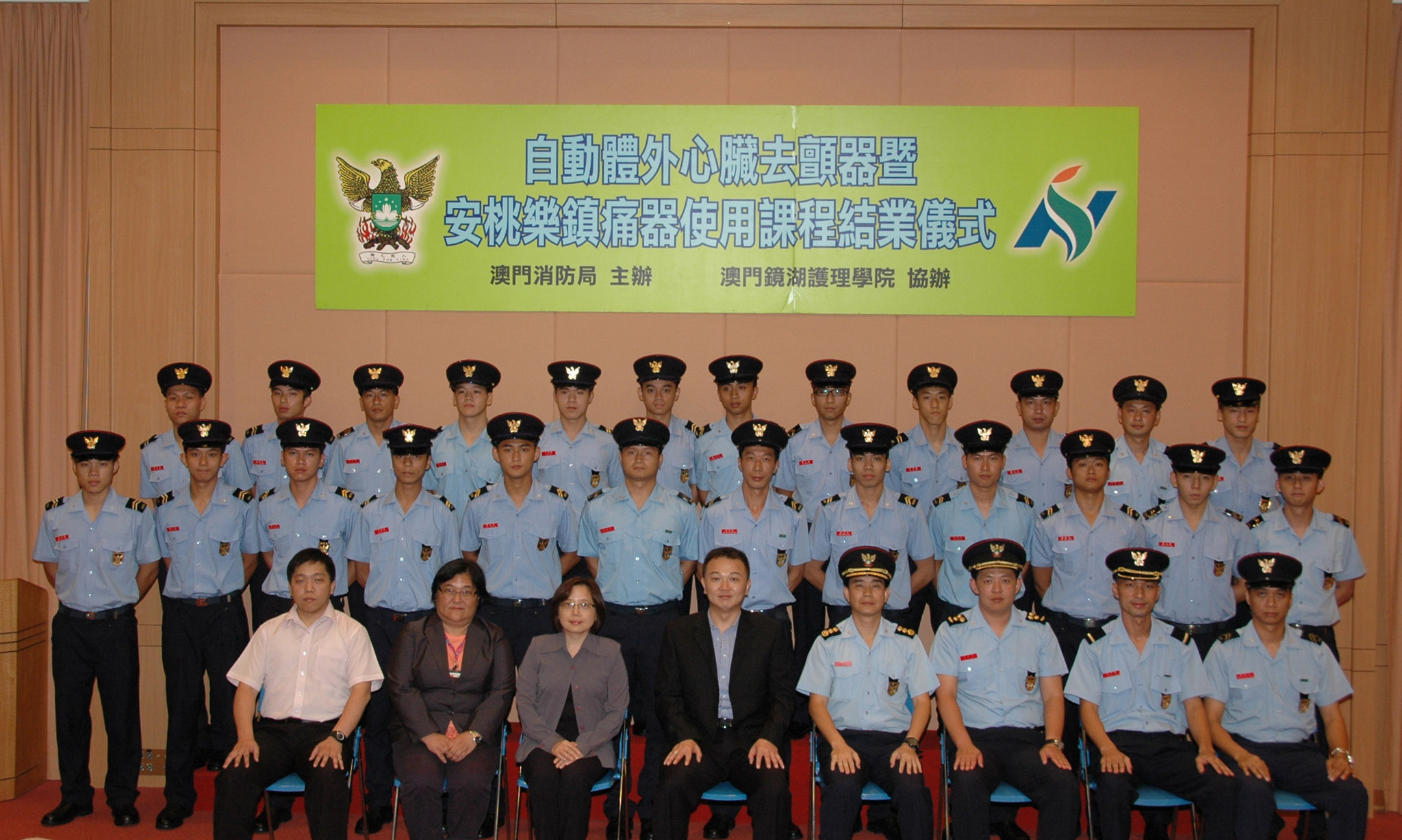 由澳門消防局及鏡湖護理學院合作開辦之「自動體外心臟去顫器暨安桃樂鎮痛器的使用證書課程」,新一期的課程於本年6月30日下午,在鏡湖護理學院舉行了結業儀式,儀式由消防局副局長余頌顯副消防總監及鏡湖護理學院院長尹一橋擔任主禮嘉賓,並向學員頒發了奬狀及結業證書。