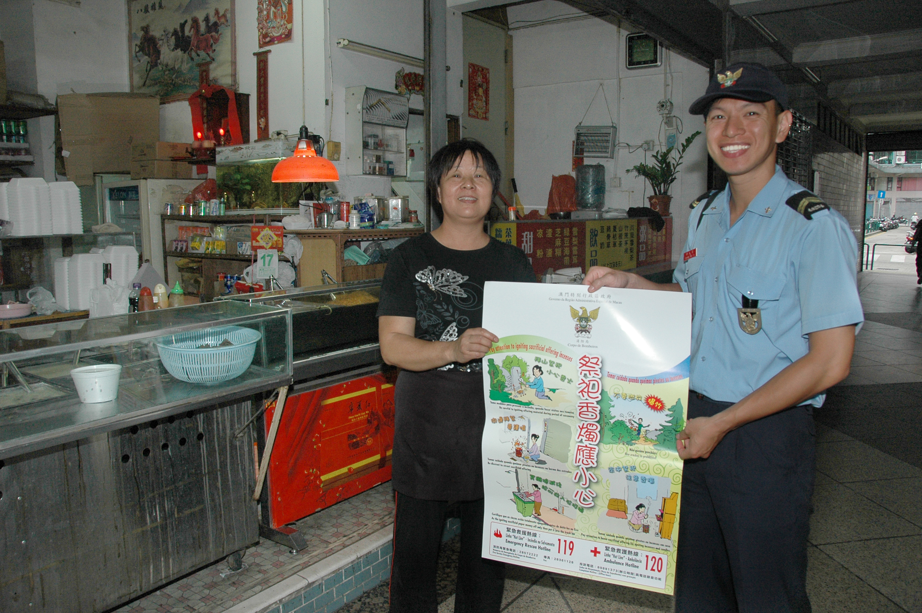 踏入農曆七月份,按照中國的全統習俗,市民會進行祭祀活動並會燃燒冥鏹;有見及此,消防局人員於本年8月16至20日期間(盂蘭節前),在防火宣傳車的配合下,於關閘、台山、青洲、及筷子基及高士德等地區,派發“祭祀香燭應小心”宣傳單張及海報,目的是希望透過是次防火宣傳活動,加強市民的防火安全意識,避免因有關祭祀活動而造成火災的危險。