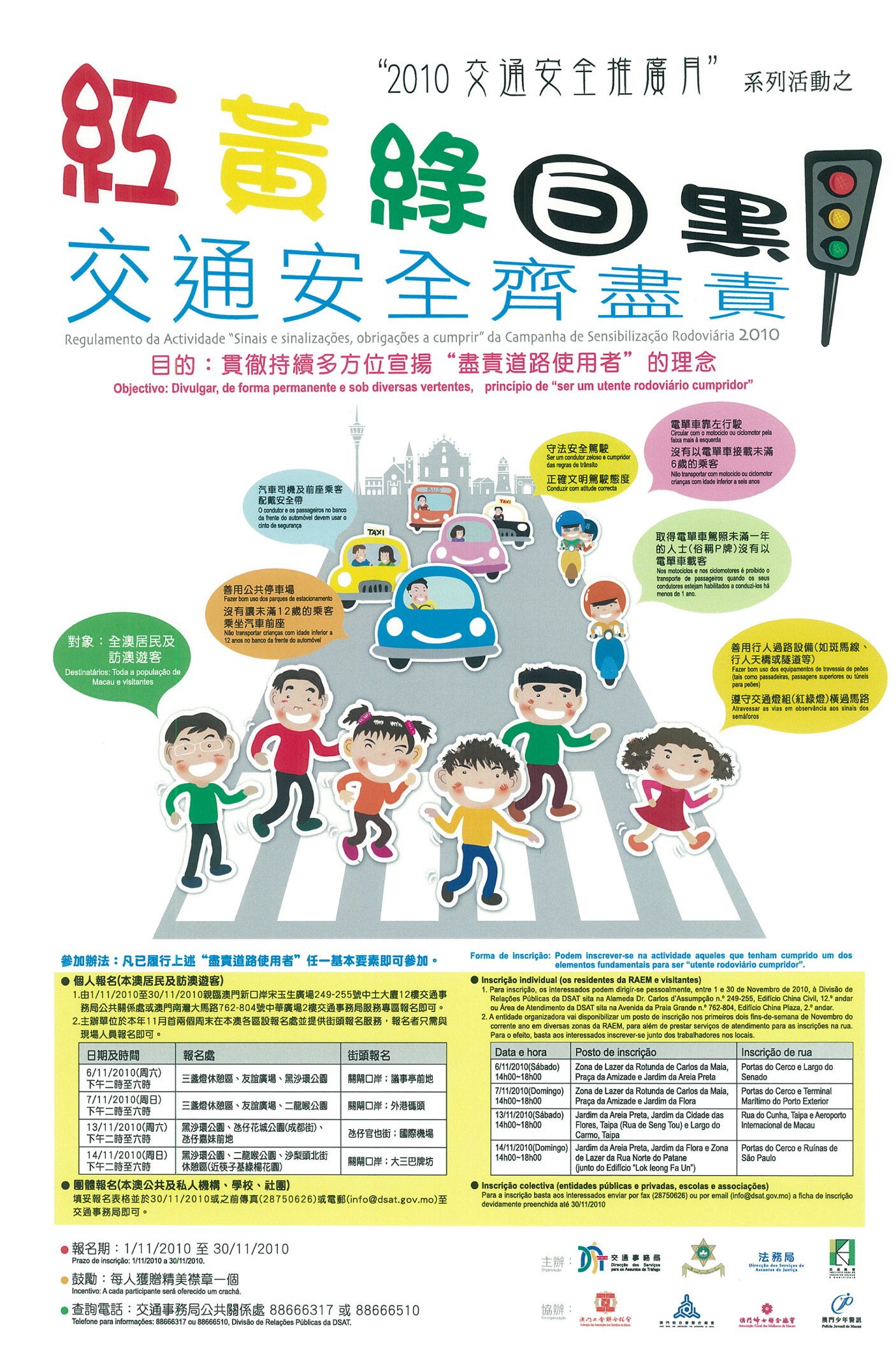 由交通事務局、治安警察局、法務局及民政總署合辦的「紅黃綠白黑 交通安全齊盡責」為「2010交通安全推廣月」系列活動之一,活動目的在於多方位宣揚“盡責道路使用者”理念,提高道路使用者的守法意識,以構建和諧安全的交通環境。“盡責道路使用者”的基本要素包括:守法安全駕駛、正確文明駕駛態度、善用行人過路設備、遵守交通燈號、善用公共停車場、電單車靠左行駛、汽車司機及前座乘客配戴安全帶、沒有以電單車接載未滿6歲的乘客、沒有讓未滿12歲的乘客乘坐汽車前座、取得電單車駕照未滿一年的人士(俗稱P牌)沒有以電單車載客等。