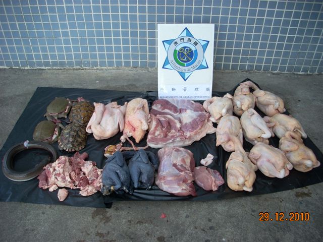 經調查後,共緝獲物:草龜2隻、水魚2隻、烏雞2隻、鴨2隻、豬肉重6公斤、羊肉重1.5公斤及風鱔1條,合共約總重17公斤。