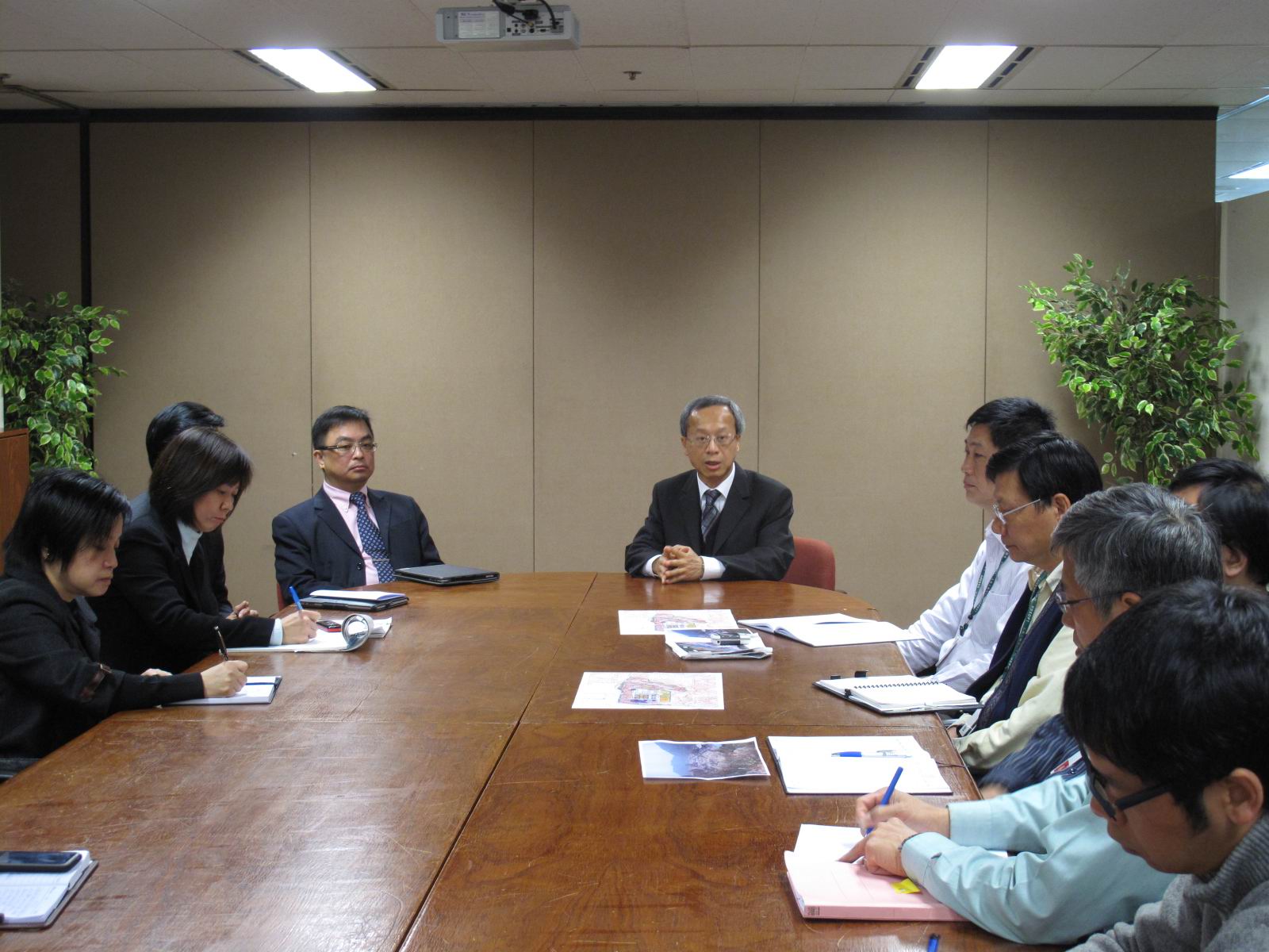 運輸工務司司長劉仕堯、司長辦公室主任黃振東今早前往屬下的土地工務運輸局,與局長賈利安、副局長陳寶霞及劉振滄,以及與收回霸地、建設工作等相關主管及工作人員座談。工務局人員介紹目前的工作進度,日前在路環高頂馬路收回土地的圍網及清遷工作,預計本周內完成,隨即進行基建設計,以配合整體規劃及毗鄰石排灣公屋項目的開展。