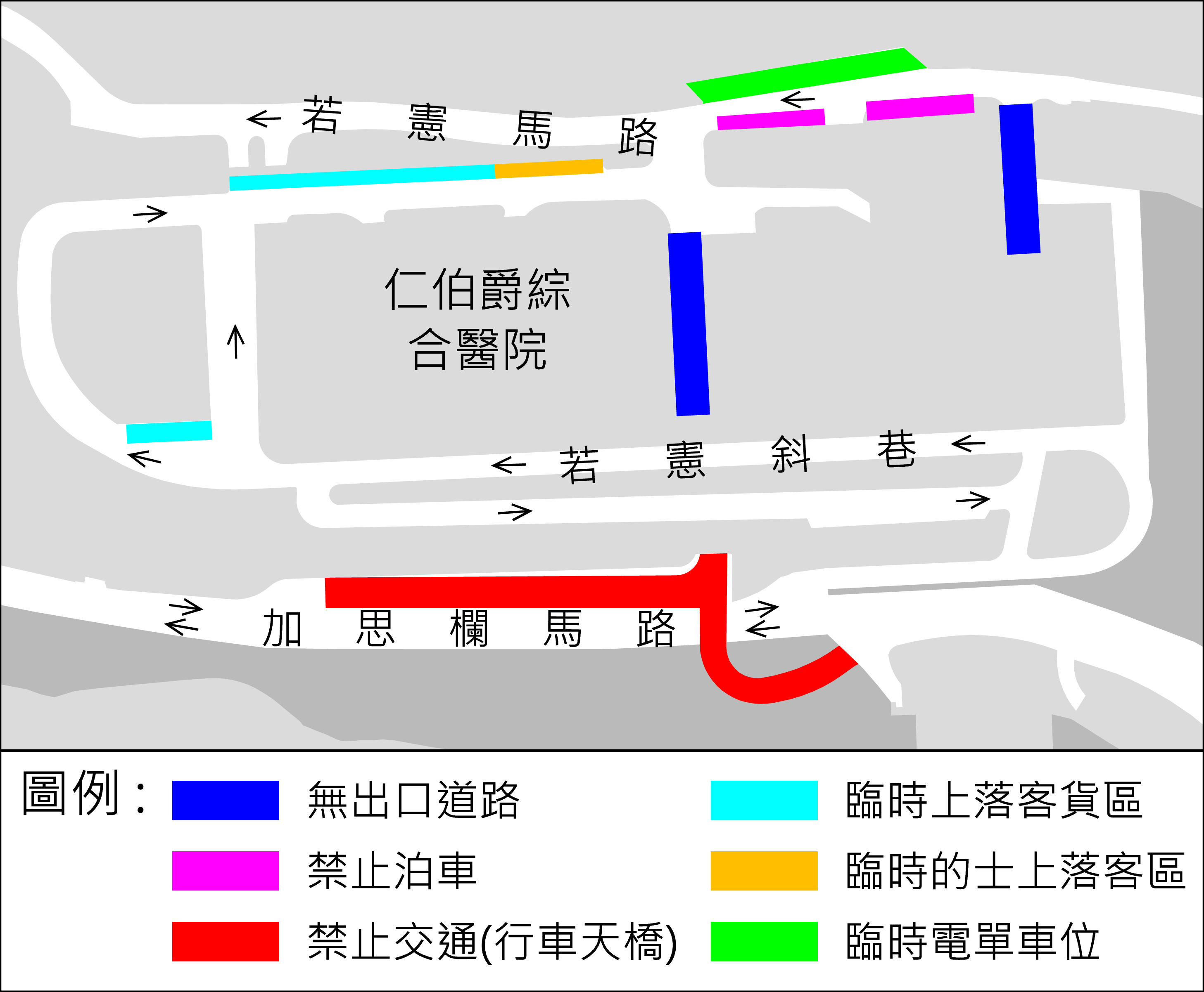 配合山頂醫院擴建工程施工,位於若憲馬路及加思欄馬路的輕型汽車及電單車泊位、上落客貨區等將於4月1日(周五)上午11時起作出調整,介乎若憲馬路與若憲斜巷之間的兩段行車道亦將改為無出口道路,為期300日,而位於山頂醫院急診部天橋下方之臨時巴士站及電單車泊位亦會取消,交通事務局呼籲駕駛者留意有關交通改動。