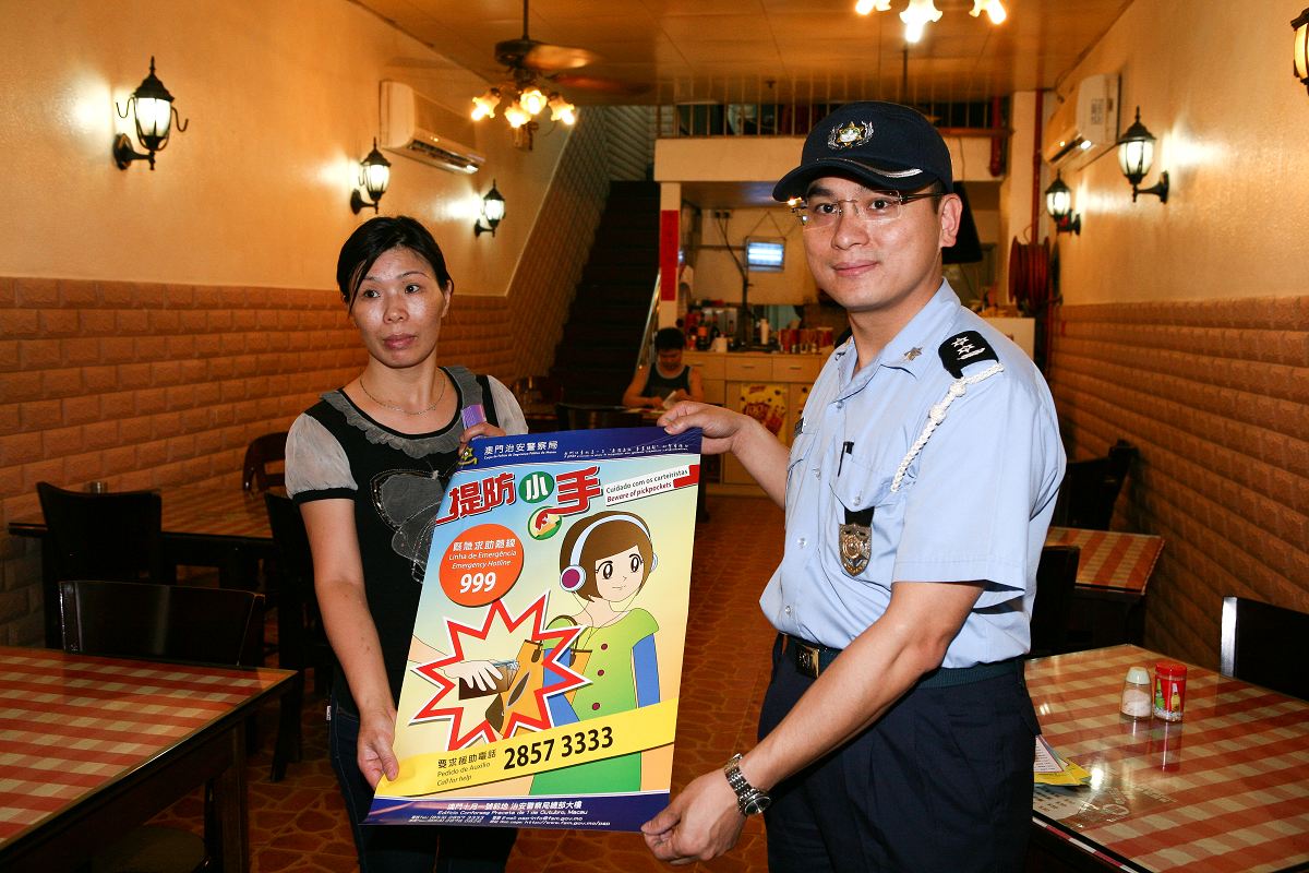 今天上午,本局公共關係處副警司黃超文及澳門警務廳副警司陳溥棠到澳門東北區保利達花園及廣福祥花園進行大廈滅罪宣傳工作,向居民派發“慎防門戶保安全”小及“舉報不法.全民有責”小冊子,講解常見大廈犯罪情況,提醒注意家居安全,同時暑期外出旅遊時須注意加強防盜措施;呼籲住客守望相助,管理員及住客遇到犯罪及可疑情況應報警求助,勿讓不法份子消遙法外;宣傳亦得到大廈管理處及食肆的支持,在十多幢大廈及食店、商店內張貼宣傳海報,提高防罪意識。此外,亦對圍繞屋苑範圍的市民、行人等宣揚防治犯罪、警民合作的訊息。整項宣傳活動由11時開始至12時半左右結束。