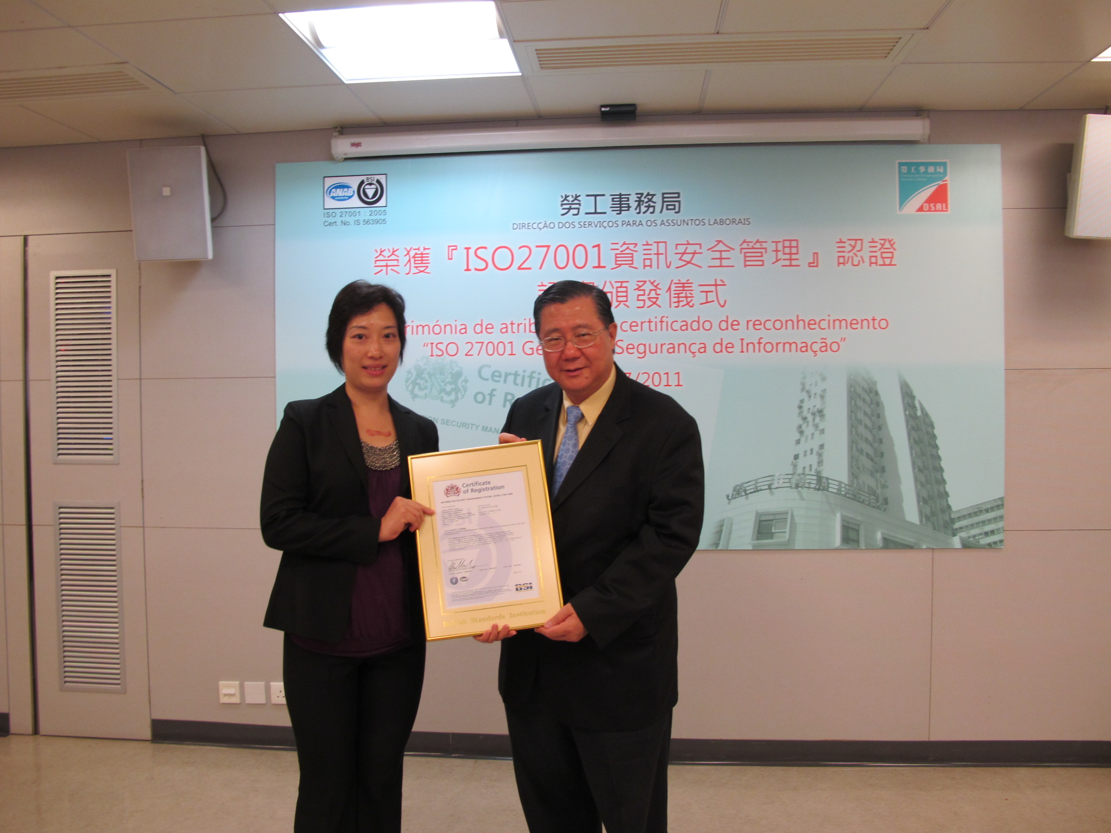 成功獲得ISO27001的認證,反映勞工事務局研究及資訊廳的資訊保安工作達到國際水平,並為該局的資訊安全管理系統提供了一套執行準則,使資訊的機密性、完整性和可用性受到嚴密的保障,藉此為市民提供優質及安全的服務。