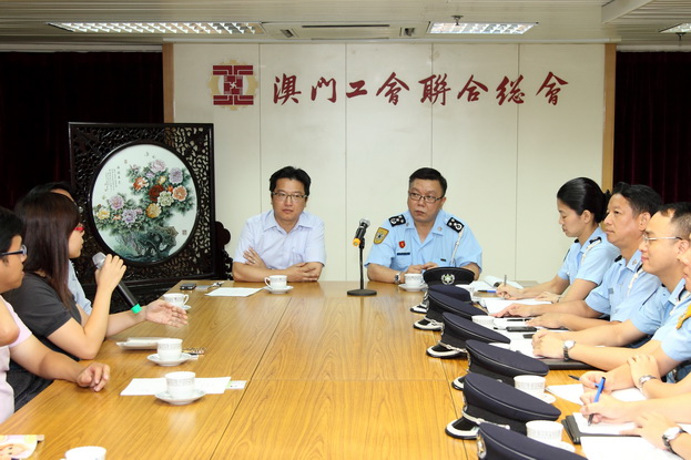 為加強與本澳社團的溝通合作,七月二十六日上午本局拜訪了澳門工會聯合總會。在交通廳廳長梅山明警務總長的帶領下,公共關係處處長劉運嫦副警務總長聯同張映順警司,以及澳門警務廳、交通廳、行動廳的警官代表一行九人獲工聯理事長鄭仲錫、副理事長梁偉峰、李靜儀、秘書長江銳輝等親切接待。