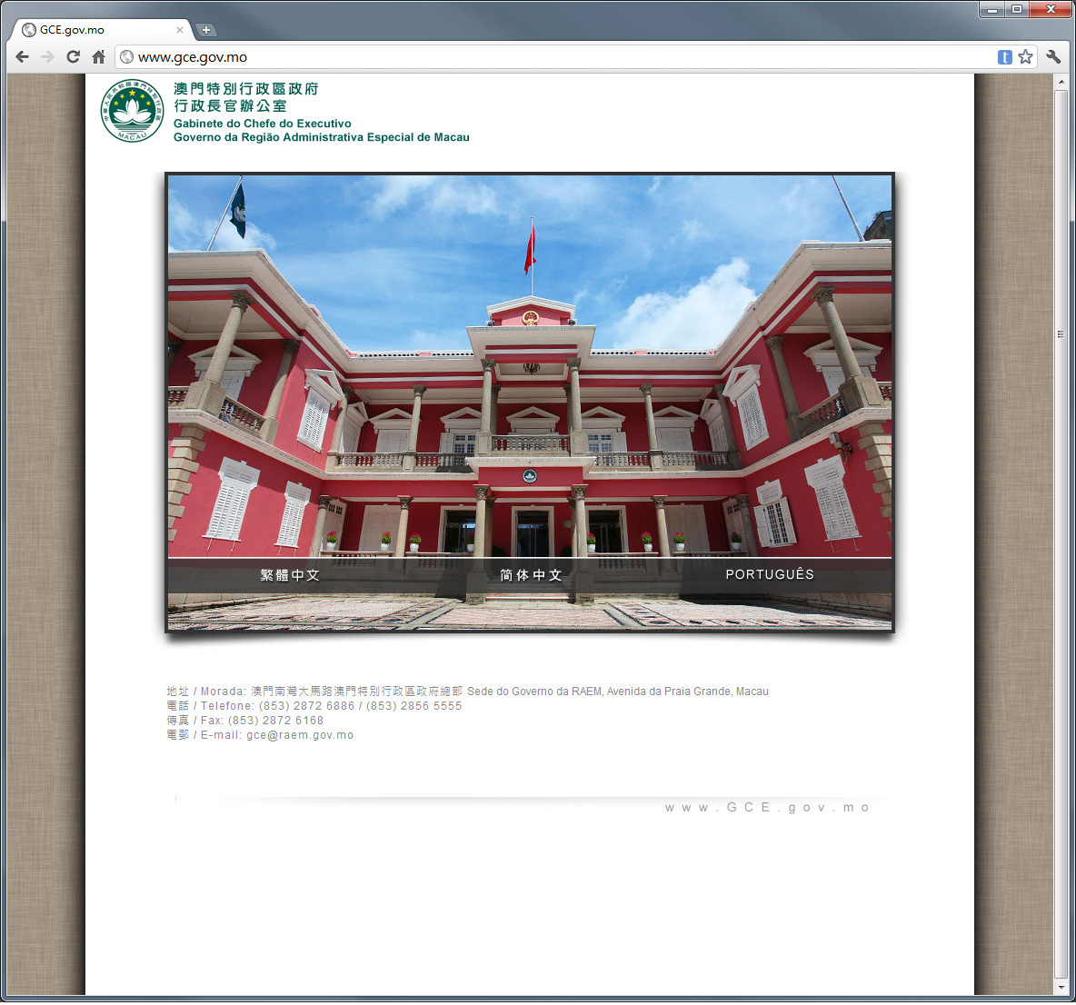 澳門特區政府行政長官辦公室今日起開通全新官方網站:www.gce.gov.mo 。行政長官崔世安在網站歡迎辭中表示:現今社會需要更多的資訊、溝通和參與,更需要拉近你我之間的距離;希望網站成為公衆參與和互動的網上渠道,借助資訊技術的應用,讓生活更加美好。