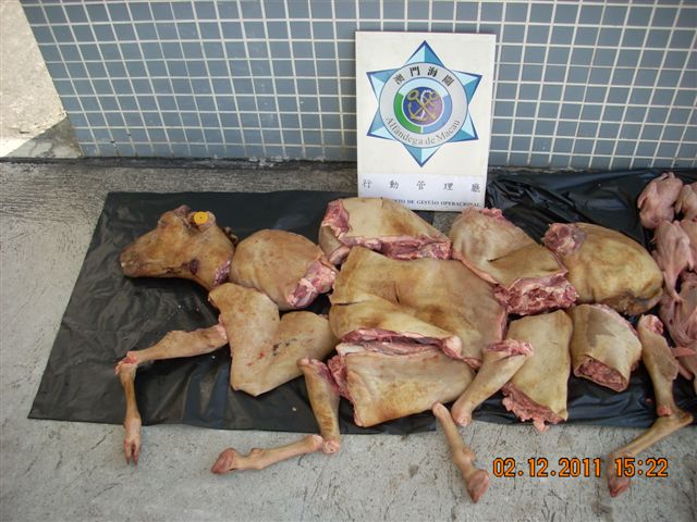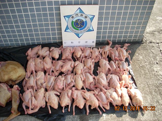 澳門海關接獲市民舉報,在麻子街有食肆進口未經撿疫的肉類作為餸菜材料,並售予公眾。經過多回監視,今天(2011年12月2日)下午,海關人員採取行動,成功緝獲已宰鮮已宰鮮羊頭和羊肉共重約:24公斤,已宰鮮乳鴿40隻共重約:18公斤。事件中一名吳姓本澳男子被帶往海關總部協助調查。