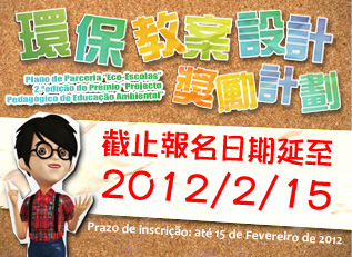 由於收到不少有意參賽者希望延長截止報名日期的查詢及意見,為鼓勵更多有志者投入推動環境教育行列,主辦單位現將第二屆《環保教案設計奬勵計劃》之截止報名日期由原定的2012年1月31日延至2012年2月15日,但遞交參賽作品的日期仍為2012年5月11日。有意參加者只需將填妥之報名表格以電郵(greenschool@dspa.gov.mo)、傳真(2872 5129)或親臨方式遞交至環境保護局(澳門宋玉生廣場393 至437 號“皇朝廣場”十樓)即可。有關獎勵計劃之參賽章程及報名表格可於“綠色學校”專題網頁http://www.dspa.gov.mo/greenschool/tc/main.aspx或環境保護局網頁www.dspa.gov.mo下載,並歡迎於辦公時間內致電環境保護局2872 5134查詢。