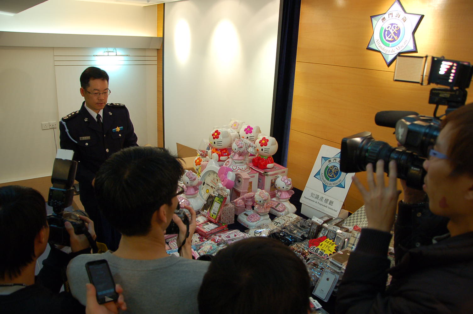 於本月一日,海關偵查人員分別對上述兩間店舖採取行動,在獲得有關品牌權利人代表的全力協助下,在涉案店舖,查獲偽冒 “HELLO KITTY”、“CHANEL”、“LV”、“GUCCI”、“DISNEY”、“HERMÈS”、“GIOGIO ARMAINI”、“BURBERRY”、 “DIOR”、“ADIDAS” 、 “LEVIS”、“RAY-BAN” 及 “APPLE”等多個品牌之銀包、電話裝飾物品、眼鏡、皮帶、座檯電話、座檯鐘、水杯、鎖匙扣及手飾物件等合共一千四百一十一件,市值超過二十五萬澳門元。據初步調查顯示,有關侵權物品經互聯網聯繫後從內地購買,再由運輸公司零散運入本澳,入貨價格為五元至一千元人民幣,出售價由十元至二千一百元澳門幣不等,而案中七百多件“HELLO KITTY”扣押物中,僅得一件坐檯鐘為正品,擺放於近收銀櫃檯當眼處給顧客展示。該兩間店舖開業約有一年,均同屬於一名持香港身份證之女嫌犯及一名本地男嫌犯開設。其故意將店舖開設在大三巴旅遊旺區,顧客對象以遊客為主,並涉嫌曾透過導遊或帶街介紹遊客購買冒牌物品。