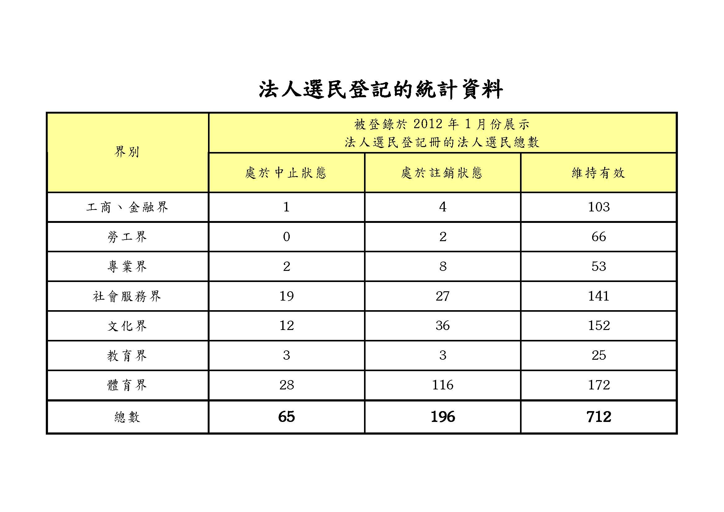 2012年選民登記冊完成展示之日起,共有188個法人選民因欠交年度總結報告被依法註銷登記效力。根據現行《選民登記法》第35條第2款的規定,法人自登記效力被中止的5個曆年內再次欠交年度總結報告,其選民登記自下一個選民登記冊完成展示之日起註銷。