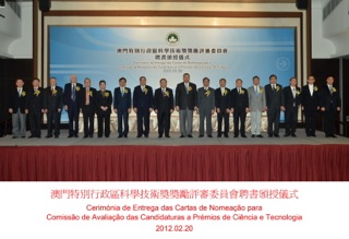 澳門科學技術獎獎勵評審委員會揭牌儀式於二月二十日上午十一時三十分假澳門旅遊塔會展娛樂中心三樓舉行。澳門特別行政區行政長官崔世安博士、中央人民政府駐澳門特別行政區辦公室白志健主任、外交部駐澳門特別行政區特派員公署胡正躍特派員、經濟財政司譚伯源司長、運輸工務司劉仕堯司長、行政長官辦公室譚俊榮主任、澳門科學技術發展基金行政委員會主席唐志堅等出席了儀式。來自本澳政府部門、高等院校、科研院所和科技社團等逾一百五十位代表參加了儀式。