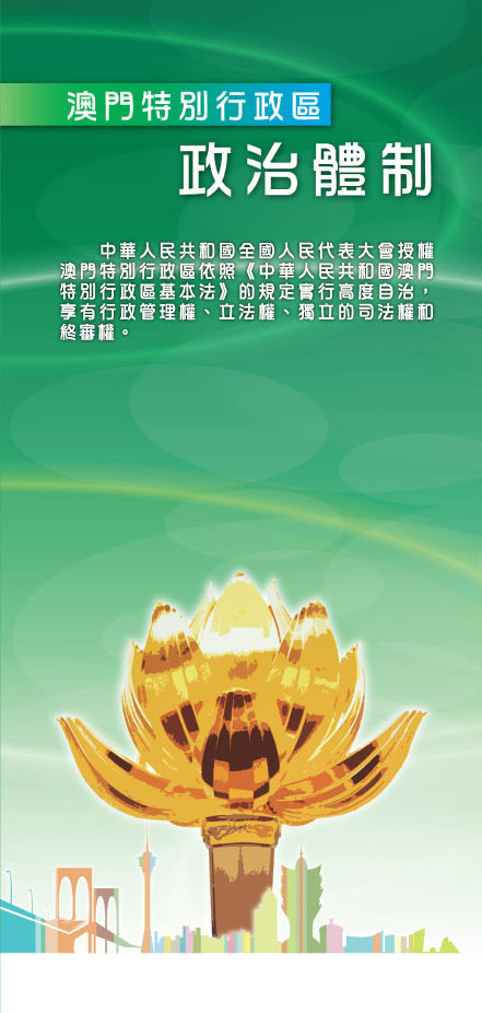 是次單張內容主要介紹現時行政長官、行政機關、立法機關及司法機關的組成和職權,例如:澳門特別行政區行政長官,由具廣泛代表性的三百名委員組成的選舉委員會選出,由中央人民政府任命。立法會設主席、副主席各一人,由全體議員互選產生。立法會議員由直接選舉、間接選舉及行政長官委任產生,現屆的直選議員12名、間選議員10名及委任議員7名,合共29名。