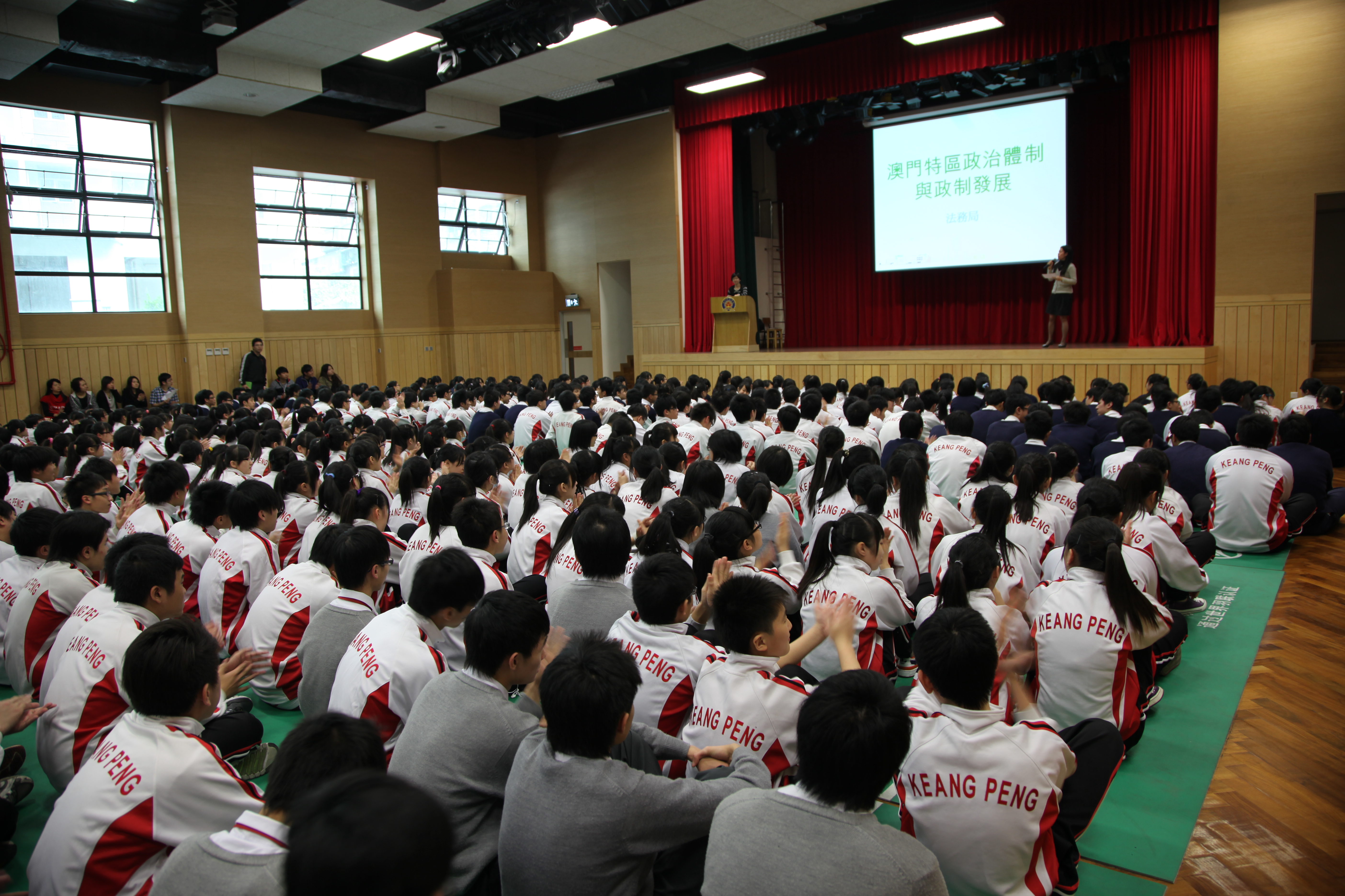 “澳門特區政治體制和政制發展講座”直至目前為止已有7所中學,合共4,638名學生參加,近日(3月26日)為鏡平學校中四至中六的637名學生舉辦該講座,由法務局的法律人員負責主講,為學生們講解《基本法》第四章政治體制的內容,包括行政長官、行政機關、立法機關和司法機關的規定。例如:行政長官由一個具有廣泛代表性的選舉委員會依照《基本法》選出,由中央人民政府任命。澳門特區立法會是澳門特區的立法機關,立法會議員透過直接選舉、間接選舉和行政長官委任而產生,每屆任期為四年。在司法機關方面,包括法院和檢察院,澳門特區法院獨立進行審判,祇服從法律,不受任何干涉。澳門特區檢察院獨立行使法律賦予的檢察職能,不受任何干涉等等。