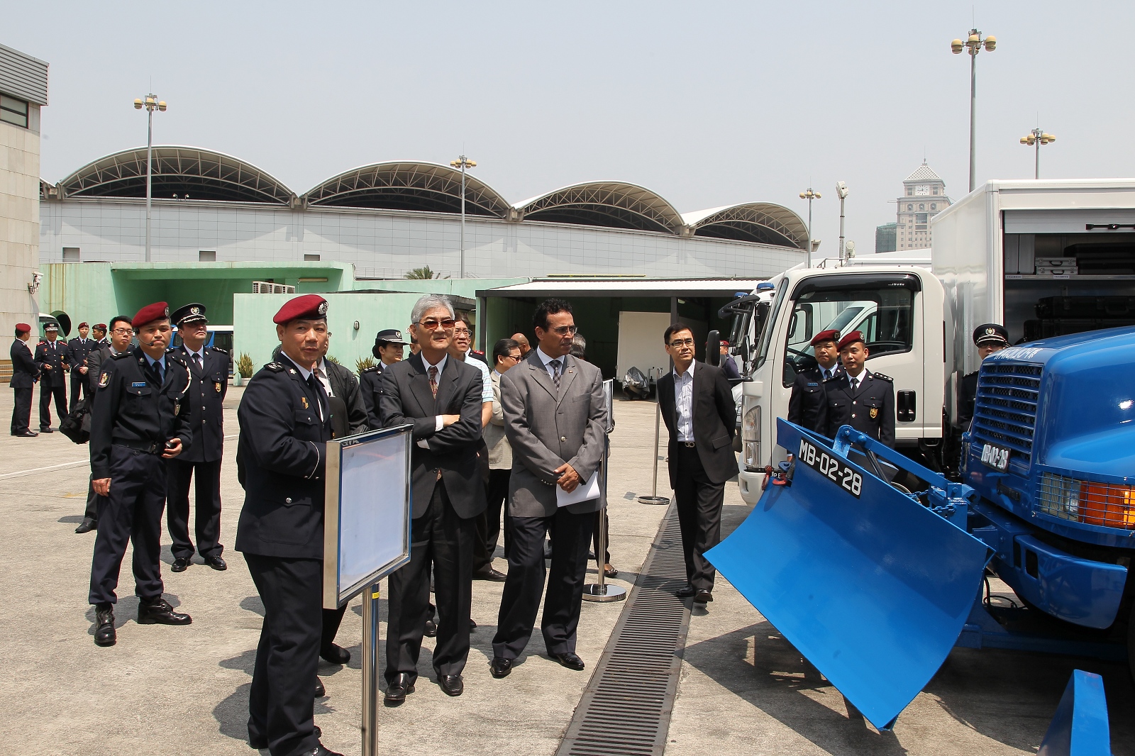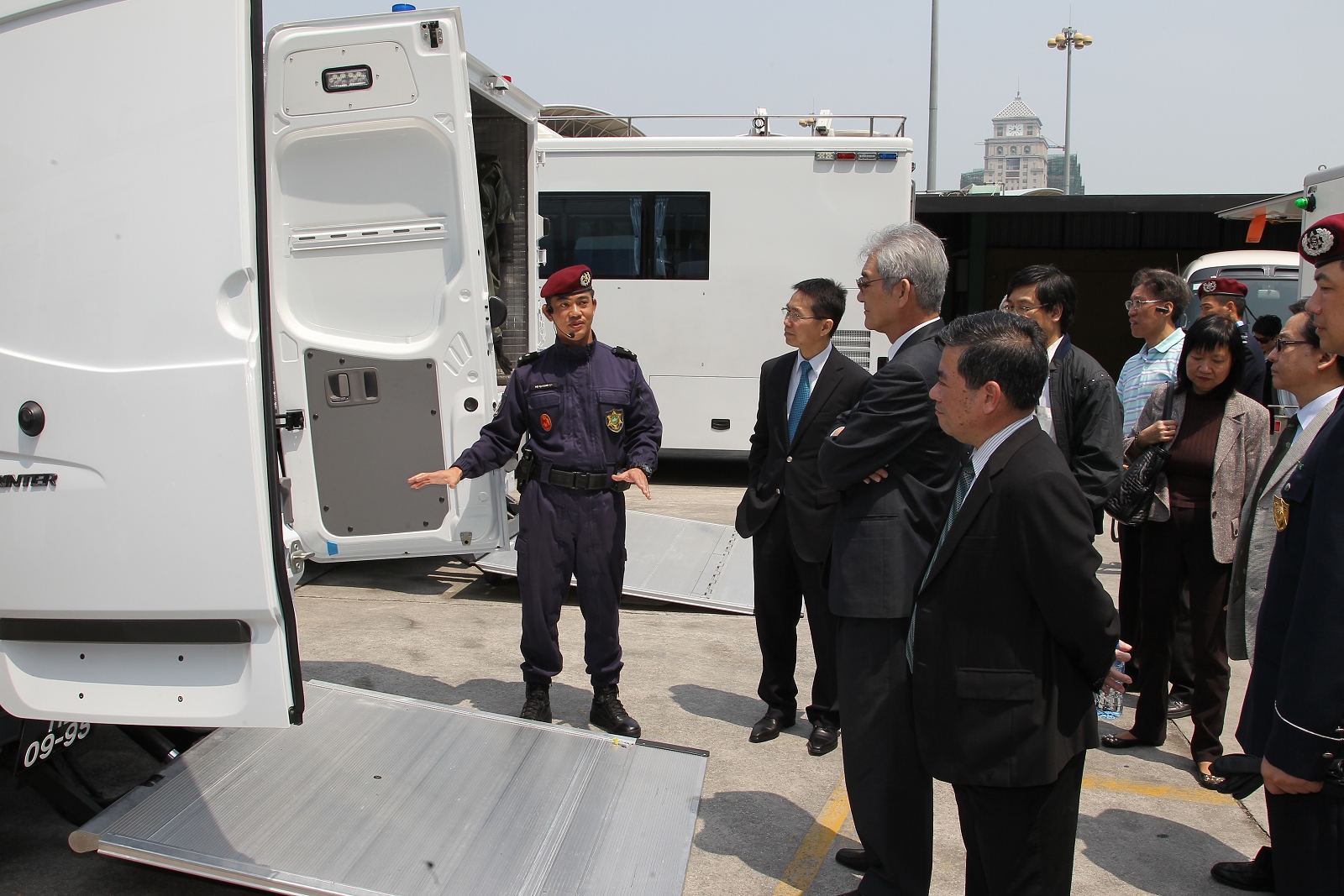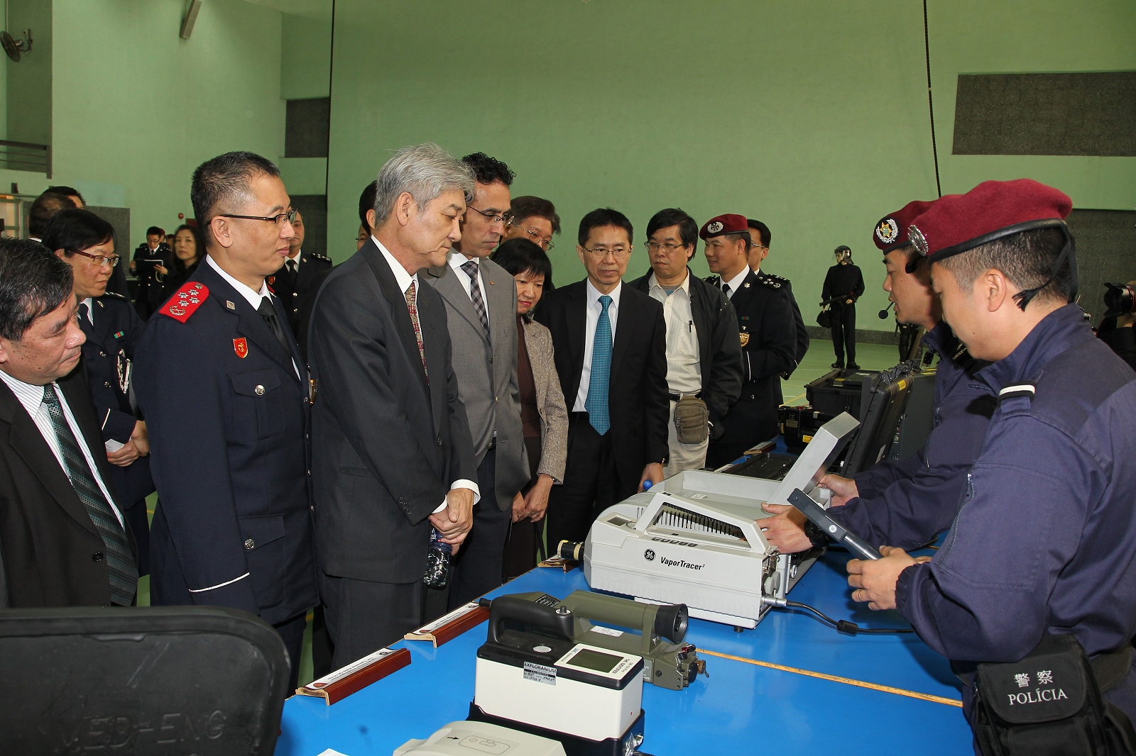 今天上午,立法會劉焯華主席、高開賢第二秘書、吳國昌議員、區錦新議員、高天賜議員、梁安琪議員、陳明金議員、何少金議員、林香生議員、麥瑞權議員、蕭志偉議員、何潤生議員一行12人到達特警隊總部,獲本局李小平局長,毛傲賢副局長、黎錦權副局長及各廳級主管熱情接待。活動先由相關部們代表向議員介紹特警隊、關閘邊境站的日常運作以及治安警察局的最新情況,期間各領導主管與議員們積極交流,聽取寶貴意見。其後一行人繼續參觀警犬隊緝毒、服從及攻擊等演練。此外,特警隊安排了幾個特殊警種的裝備展示以及特種車輛介紹,防暴隊亦同場示範了防暴盾牌的多種陣式應用。多位議員對有關裝備的展示及相關的工作甚感興趣,期間紛紛主動提問,互動氣氛熱烈。
