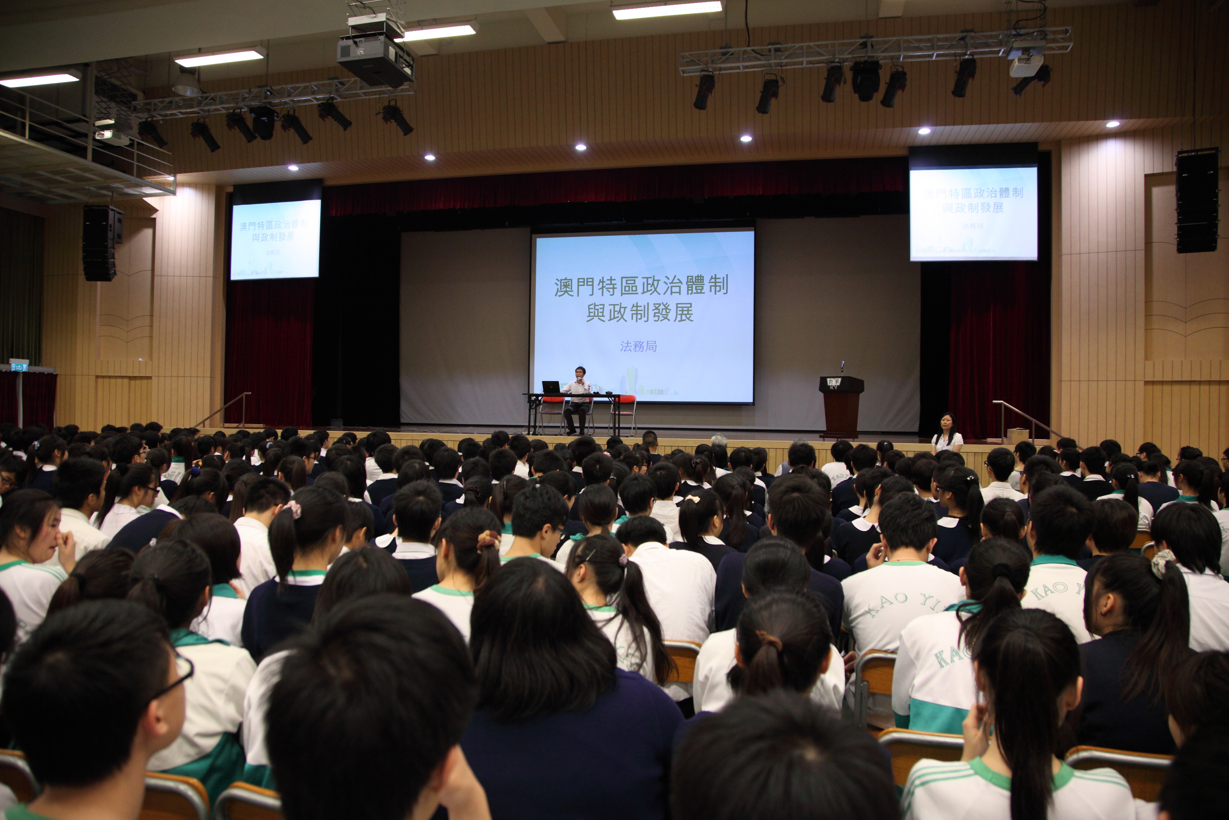是次講座由法務局的法律人員負責主講,為學生們講解《基本法》第四章政治體制的內容,包括行政長官、行政機關、立法機關和司法機關的規定。例如:行政長官由一個具有廣泛代表性的選舉委員會依照《基本法》選出,由中央人民政府任命。澳門特區立法會是澳門特區的立法機關,立法會議員透過直接選舉、間接選舉和行政長官委任而產生,每屆任期為四年。在司法機關方面,包括法院和檢察院,澳門特區法院獨立進行審判,祇服從法律,不受任何干涉。澳門特區檢察院獨立行使法律賦予的檢察職能,不受任何干涉等等。