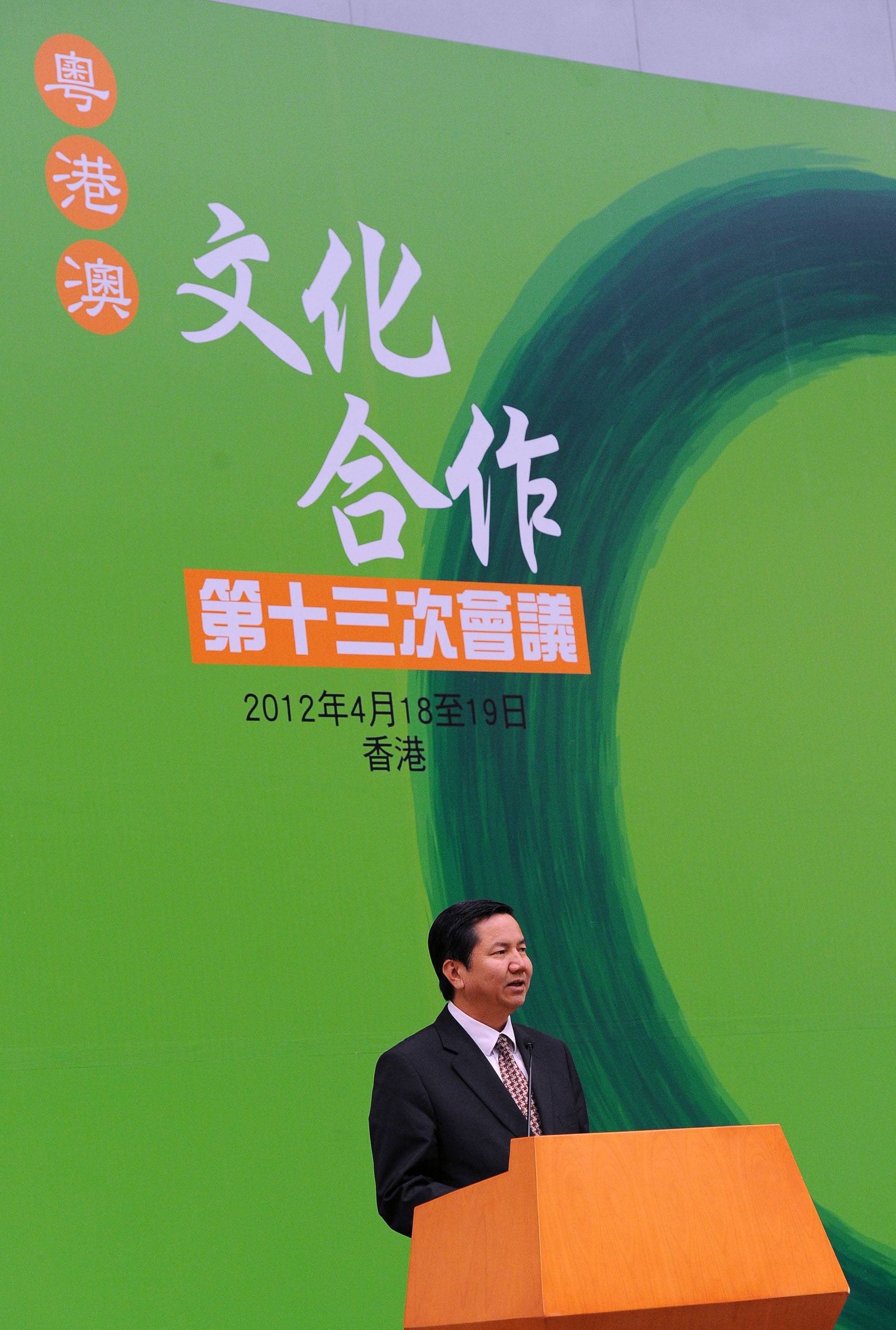 第十三次粵港澳文化合作會議日前(四月十八、十九日)在香港召開,澳門特區政府社會文化司張裕司長、廣東省文化廳方健宏廳長、香港民政事務局曾德成局長、澳門文化局吳衛鳴局長、國家文化部港澳台辦公室侯湘華主任等出席會議。三地政府逾一百五十位代表就演藝人才、文化資訊、文博合作、圖書館交流、非物質文化遺產及文創產業等六大領域分別展開深入討論。