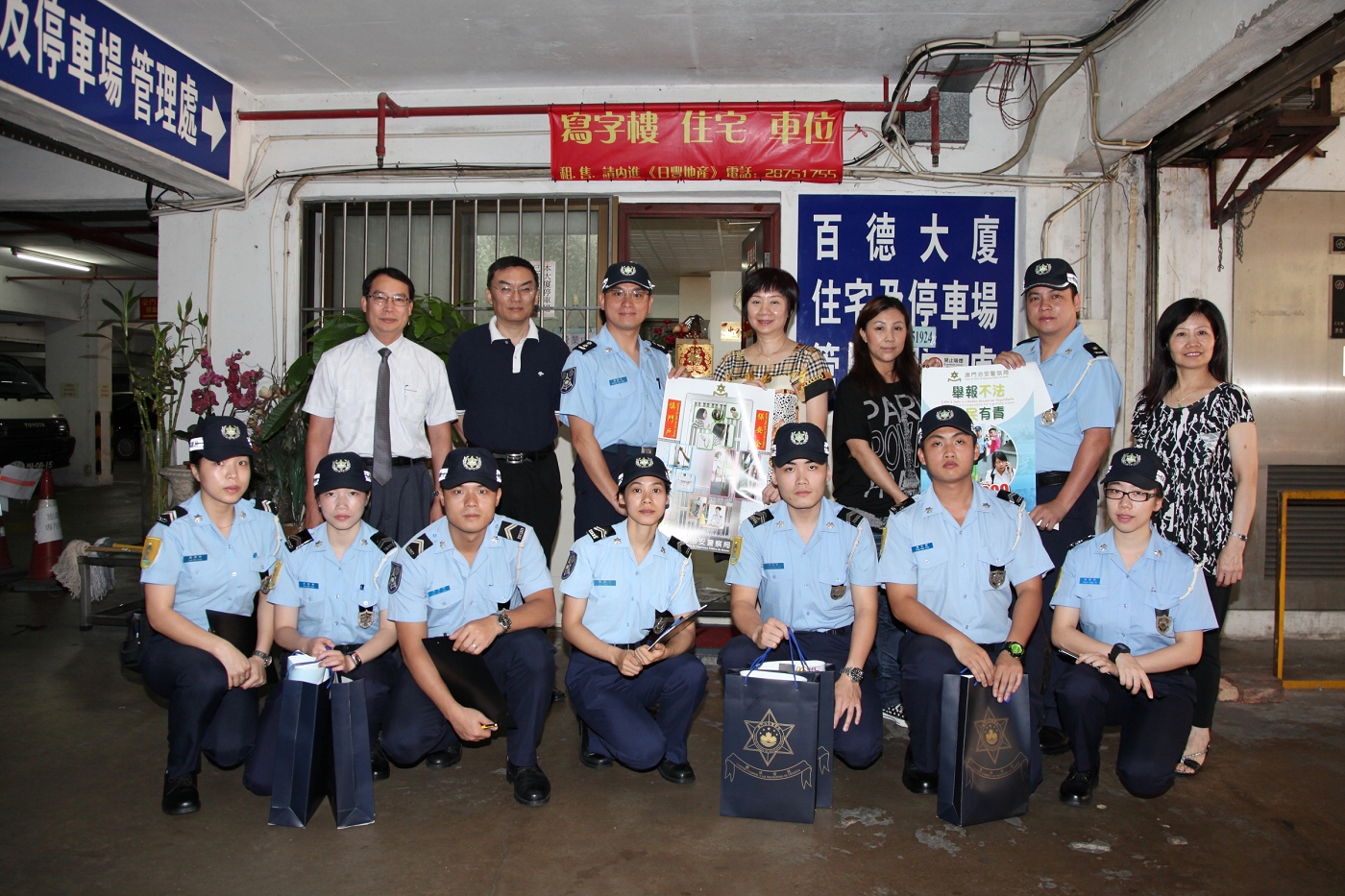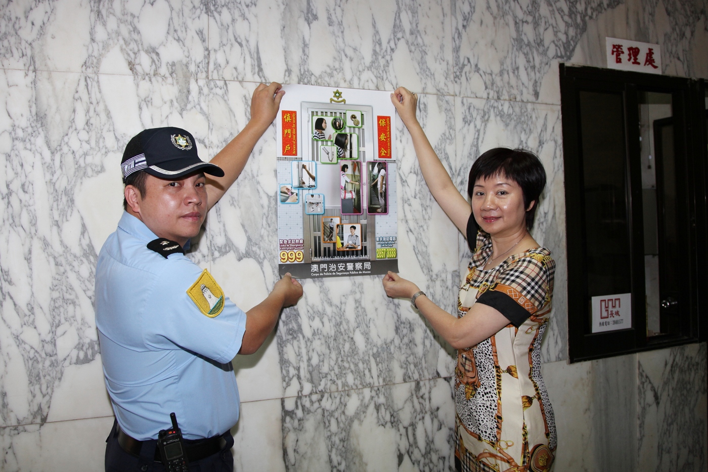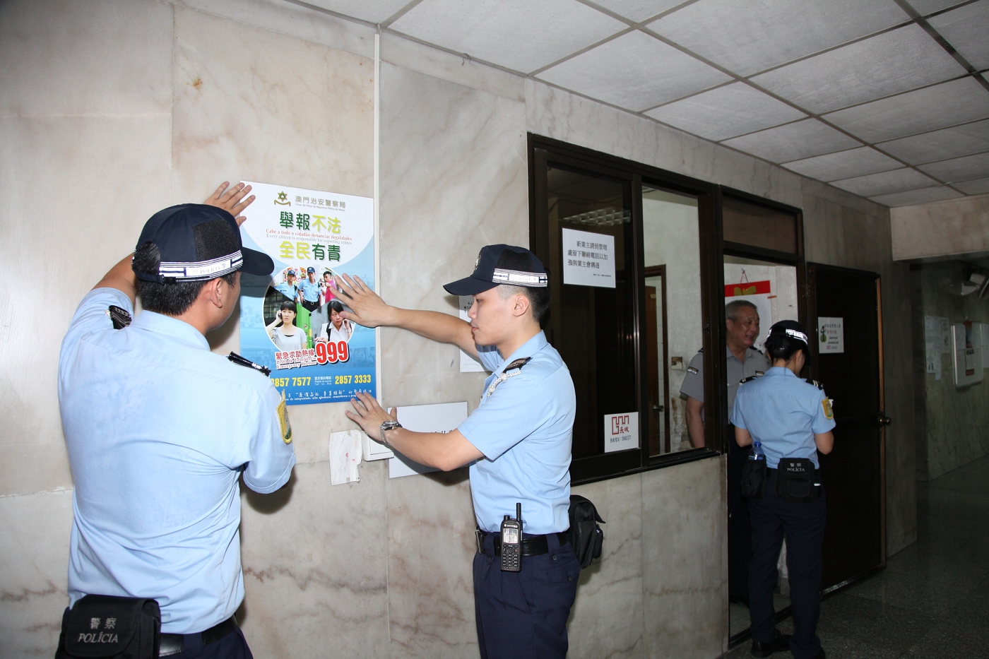 今日上午,治安警察局與新口岸坊眾互助會聯合進行社區防罪宣傳活動,本局行動廳副警司黃超文、澳門警務廳警長林錦豪等一行十人,與坊會副理事長陳愛珠、何寬慈以及理事戴鷹、劉國燊、溫絳璿等,針對大廈治安環境到區內數個大型屋苑發掘警情,派發防罪宣傳品。
