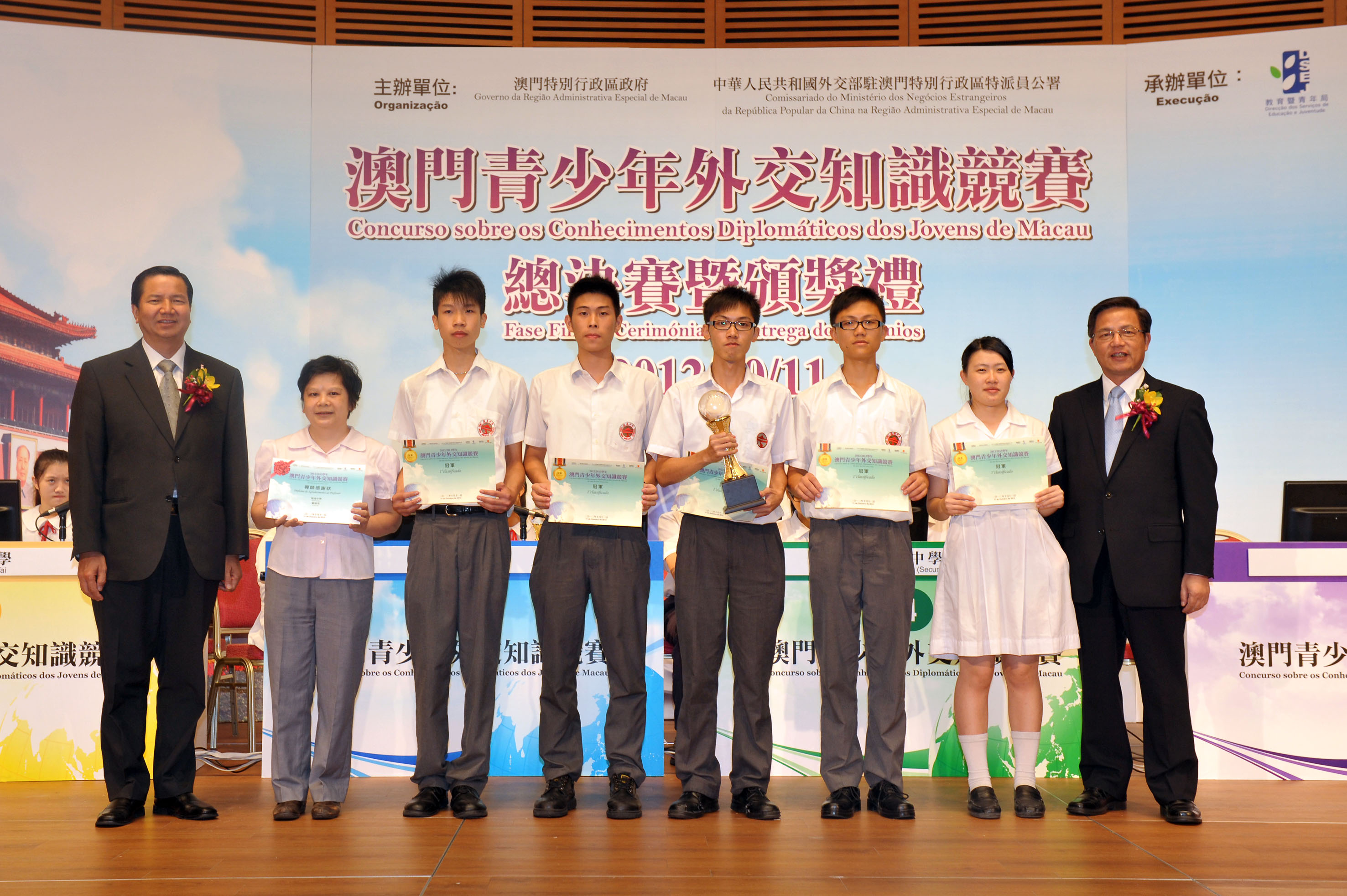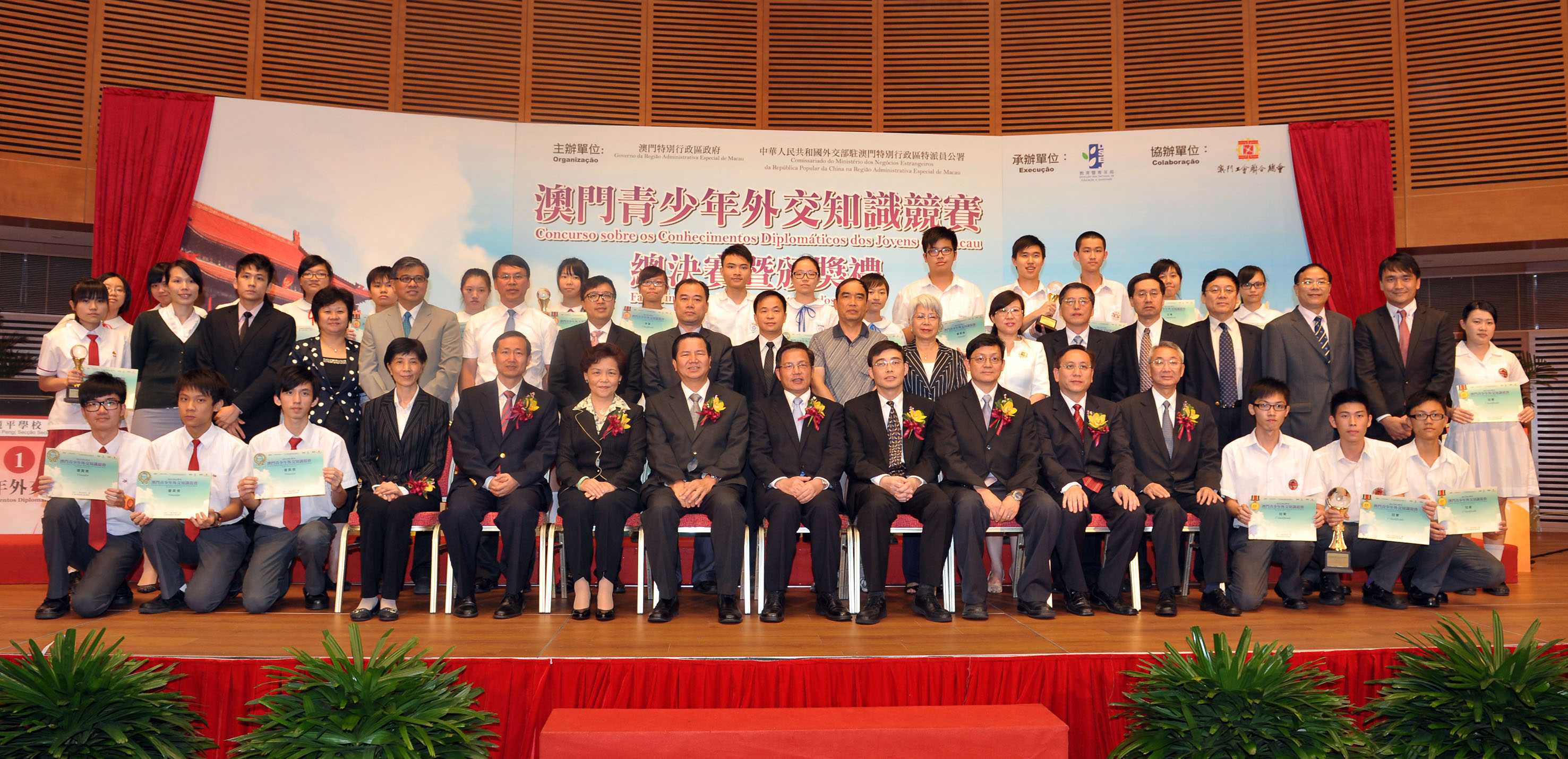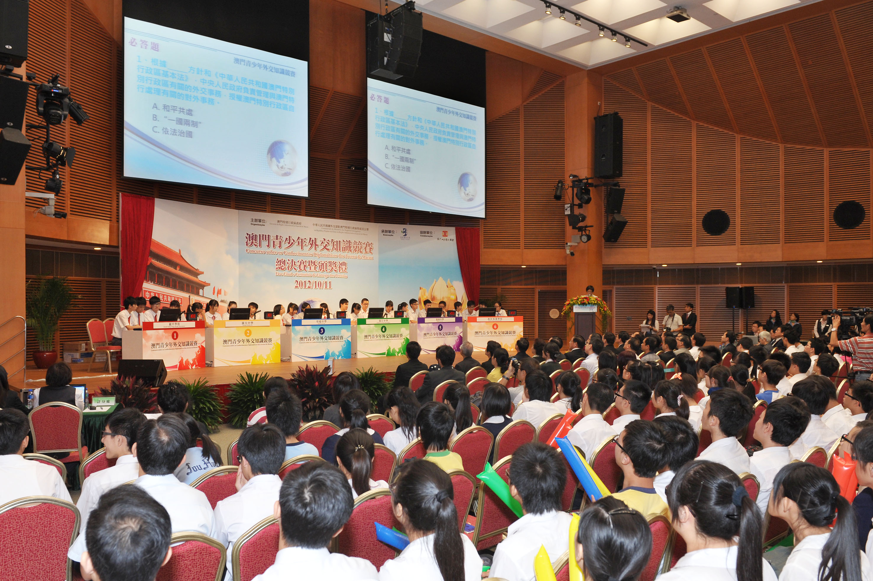為增進本澳學生對外交知識和對國際形勢的瞭解,拓展國際視野,培育全面發展的新一代,由澳門特別行政區政府和中華人民共和國外交部駐澳門特別行政區特派員公署聯合主辦、教育暨青年局承辦、澳門工會聯合總會協辦的二零一二/二零一三學年“澳門青少年外交知識競賽”總決賽暨頒獎禮於十月十一日假澳門科學館會議中心順利舉行。本澳多所中學的校長及近四百名師生出席支持此次活動,並為參賽同學打氣,現場氣氛熱烈。