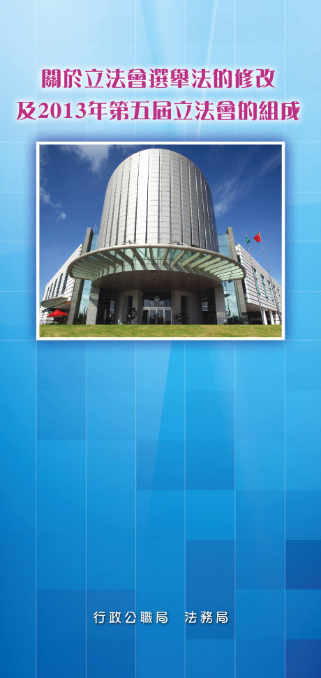 新修訂的《澳門特別行政區立法會選舉法》已於二零一二年九月十一日正式生效,為讓市民能更清楚了解有關修改的內容,法務局特別印製了“關於立法會選舉法的修改及2013年第五屆立法會的組成”單張,供市民免費索閱。