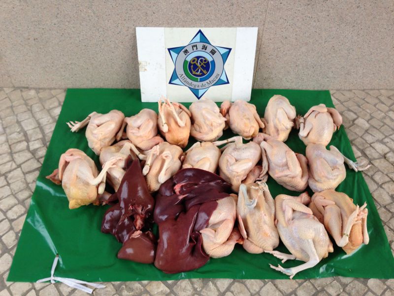本月八日早上海關行動管理廳關員在關閘外圍對水客進行監視行動,於早上七時十五分左右,海關關員發現有數名水客所攜帶的物品有異常,因此,海關關員尾隨其後,發現有關水客把攜帶回澳的數袋物品放置於菜園路永寧廣場斑馬線附近地下,約七時五十五,一男子整理有關物品準備離開時,海關關員採取截查行動,檢獲一批未經檢疫之已宰鮮雞隻,豬內臟等物品。