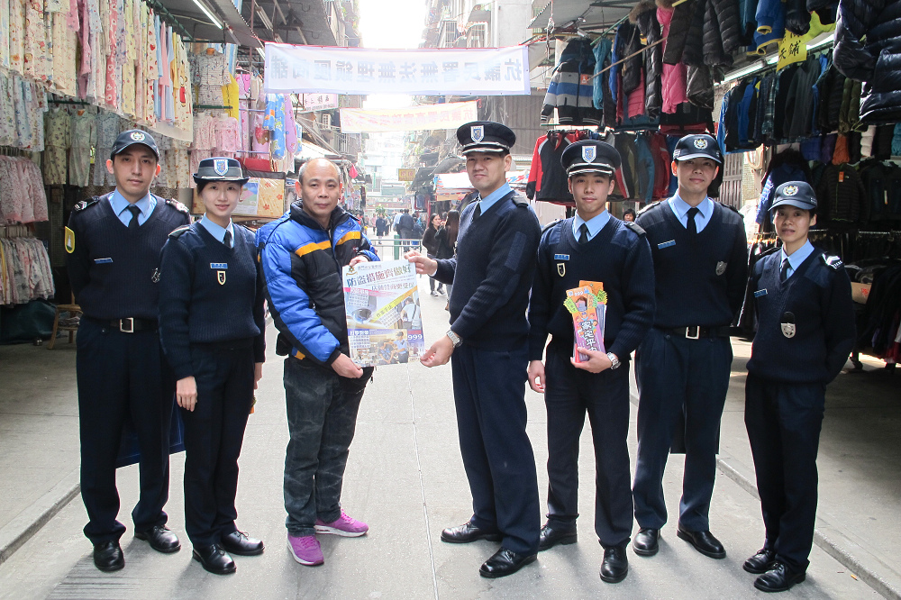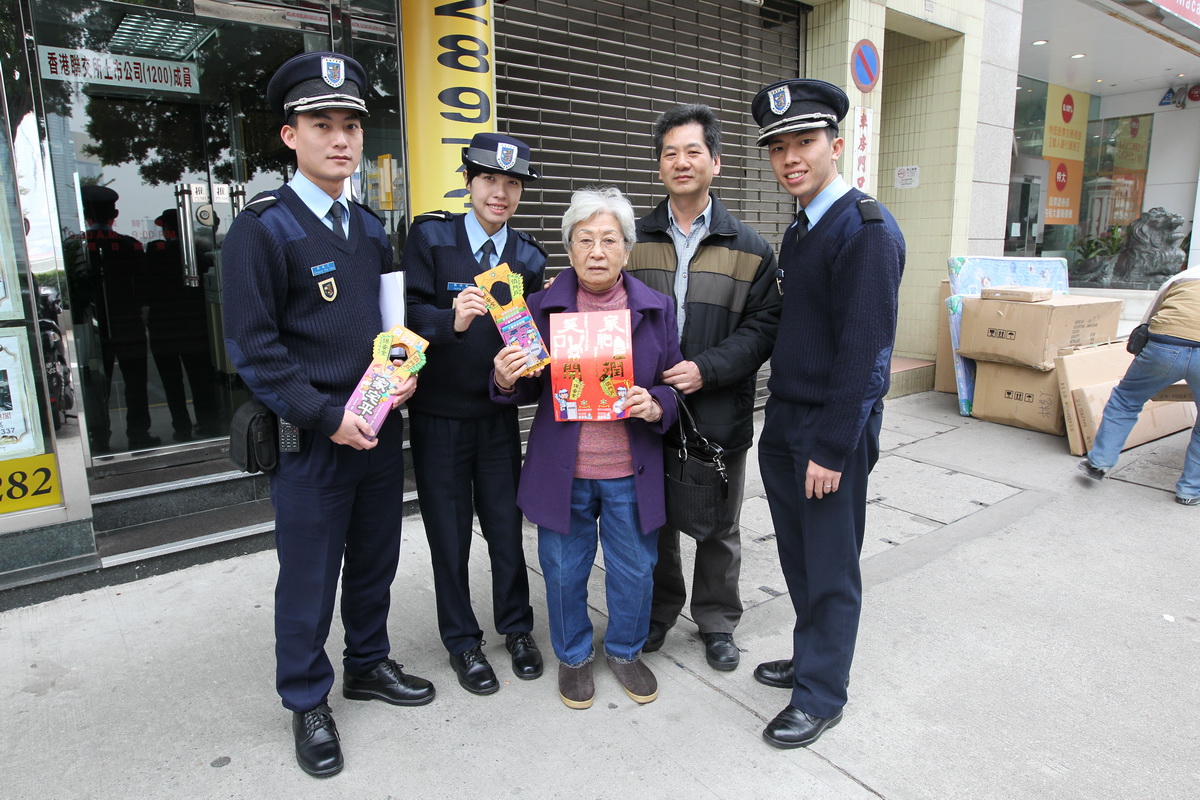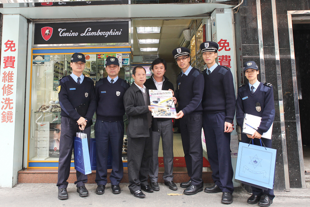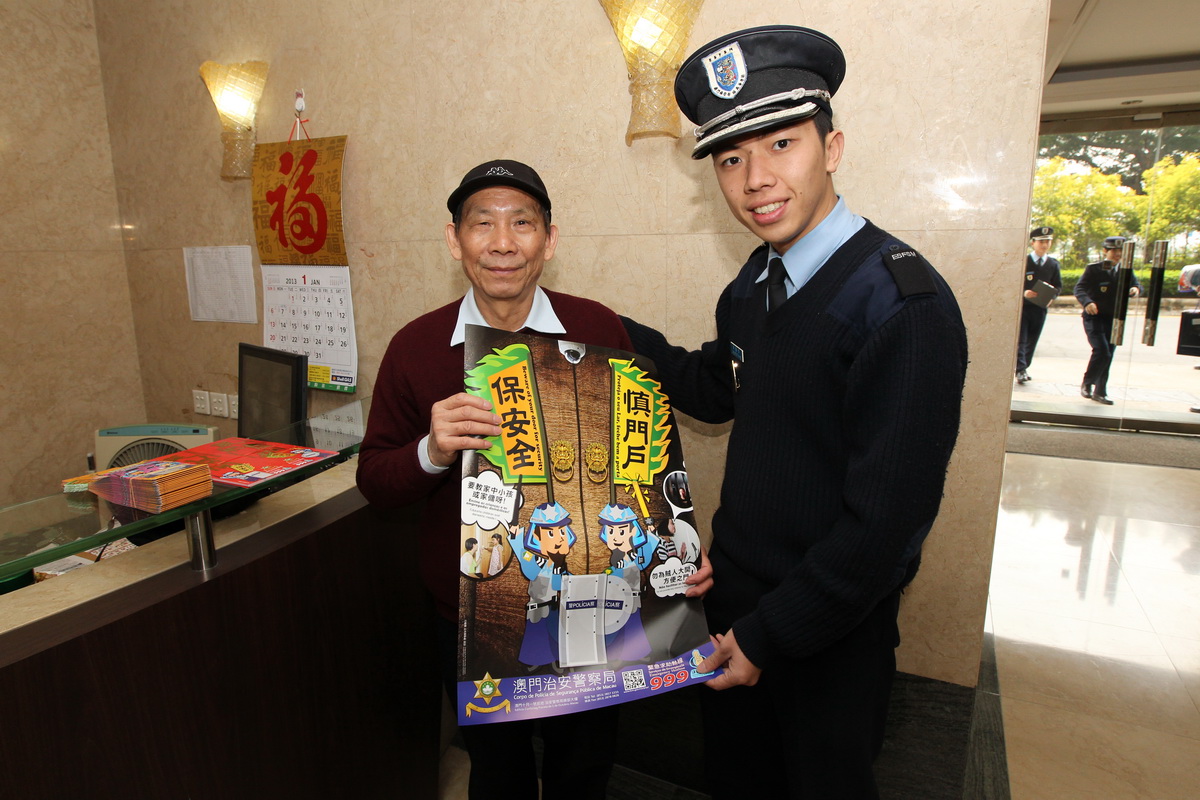 農曆新年即將到來,為配合各項相應的冬防治安工作,同時考慮到歲晚期間盜竊及騙案較為猖獗,而主因往往由於自身防範意識薄弱,故此,本局近期頻繁到本澳及離島警區加強大廈防罪、店鋪防盜騙等宣傳活動。而即將就職的準警官們學以致用,透過實地的參與發揮治安警察局服務市民的精神,連續兩天冒著寒冷到皇朝、南灣、殷皇子、關閘、黑沙環、水坑尾以及新橋義字街一帶,向不下百間的商鋪大廈、超市零售、餐廳食肆等派發新年掛曆,並沿途向市民旅客派發 “慎門戶 保安全”、 “提防小手”、 “慎防受騙”等主題的單張海報以及防罪 “揮春”。