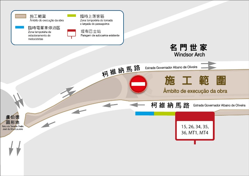為配合氹仔柯維納馬路交通樞紐及輕軌工程持續推進,位於賽馬會西閘對開的臨時車道將於本周六(20日)起封閉,禁止車輛駛入。期間,由運動場圓形地進入柯維納馬路的駕駛者如有需要往廣東大馬路或南新花園方向,可使用賽馬會正門對開的臨時車道或盧伯德圓形地迴旋處行駛。