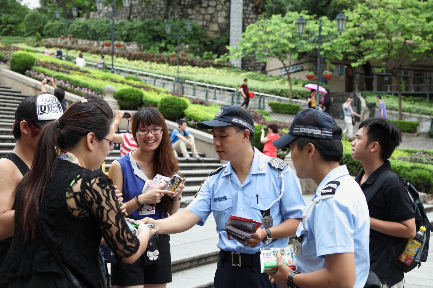 今天早上十時,本局公共關係處余志華副警司連同第一警務警司處人員一行六人,到媽閣及議事亭前地一帶進行防扒宣傳活動。期間,宣傳隊向居民及遊客派發多款防罪小冊子,講解常見的扒竊手法,並即場對財物外露的人士作出溫馨提示,提升防罪意識。