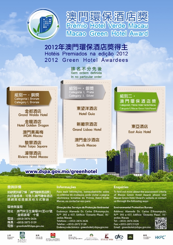 “2012年澳門環保酒店獎”經過一系列的嚴謹評審程序後,評審團確認共有9間本澳酒店獲得嘉許,當中包括:澳門金沙酒店、新葡京酒店和東望洋酒店獲得澳門環保酒店獎組別一銀獎;澳門美高梅、金都酒店、濠璟酒店、金龍酒店和駿景酒店獲得組別一銅獎。東亞酒店獲組別二澳門環保酒店獎,是首次有二星級酒店參加並獲得獎項。