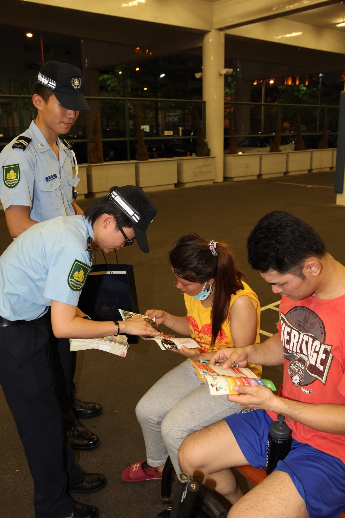 暑假臨近,治安警察局為預防在期間可能出現的青少年違法犯罪行為,是日晚上在氹仔各球場及休憩區進行防罪宣傳,向青少年派發單張、紀念品,傳遞遵守法律、潔身自愛、遠離犯罪的正面訊息;宣傳活動由公關處警司黃超文、氹仔警司處副警司張向帆以及本局宣傳小隊負責,活動過程順利。