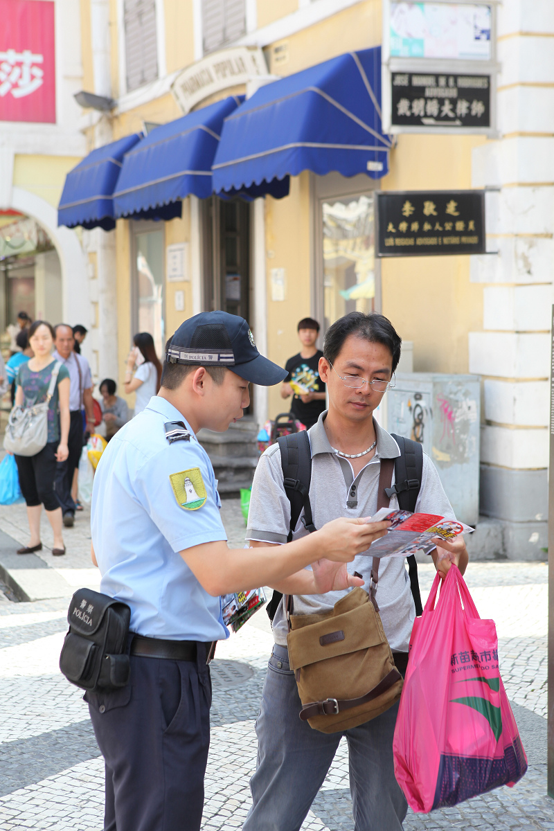今天上午,本局公共關係處副警司源劍鋒、黃志宏連同第一警務警司處人員一行七人,到議事亭前地及大三巴一帶進行防扒及防店鋪盜竊宣傳活動。期間,宣傳隊向居民及遊客派發多款防罪小冊子,講解常見的扒竊手法,並即場對財物外露的人士作出溫馨提示,讓其了解正確保管財物的方法;同一時間,宣傳隊向周邊的商鋪進行防店鋪盜竊宣傳,講解店鋪防盜的注意事項及常見的盜竊手法,提醒店員在人多擠迫的時候要提高警覺,並適時提醒顧客注意個人財物安全,在有需要時應報警求助。