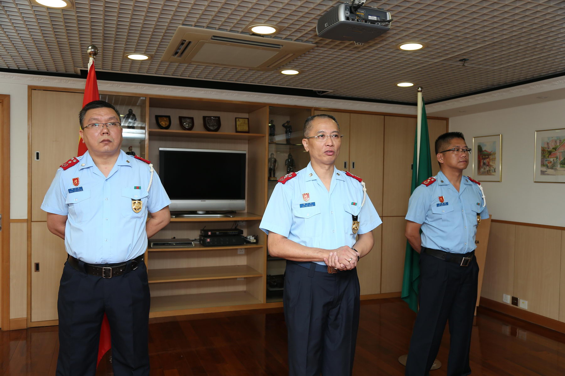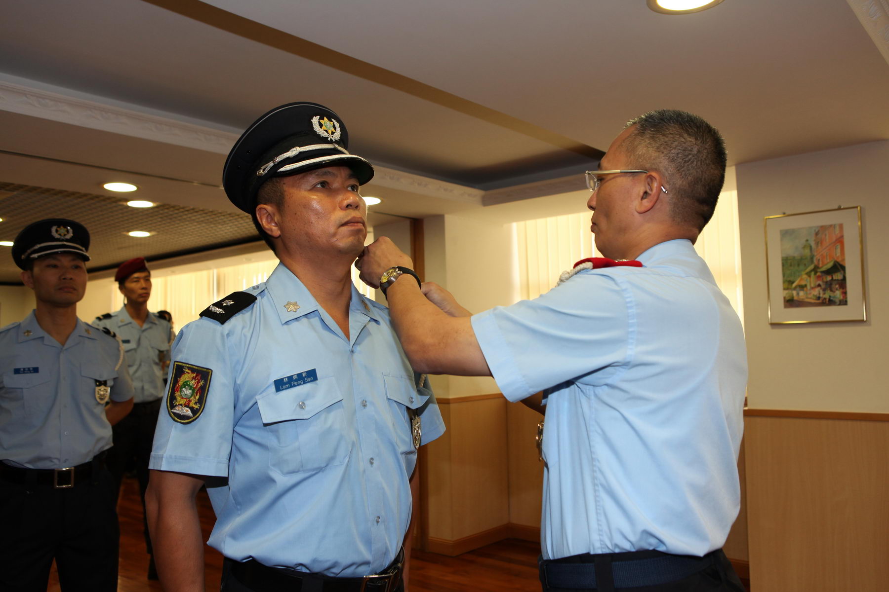 今天(十月二十五日)中午12時,在治安警察局總部貴賓室舉行了警長晉升儀式。儀式由治安警察局局長李小平警務總監及副局長黎錦權副警務總監及梅山明副警務總監主持。出席儀式的還有局內各部門的廳長及負責人,為同僚作出祝賀。晉升為普通職程警長共有13人 (男性11人,女姓2人)。