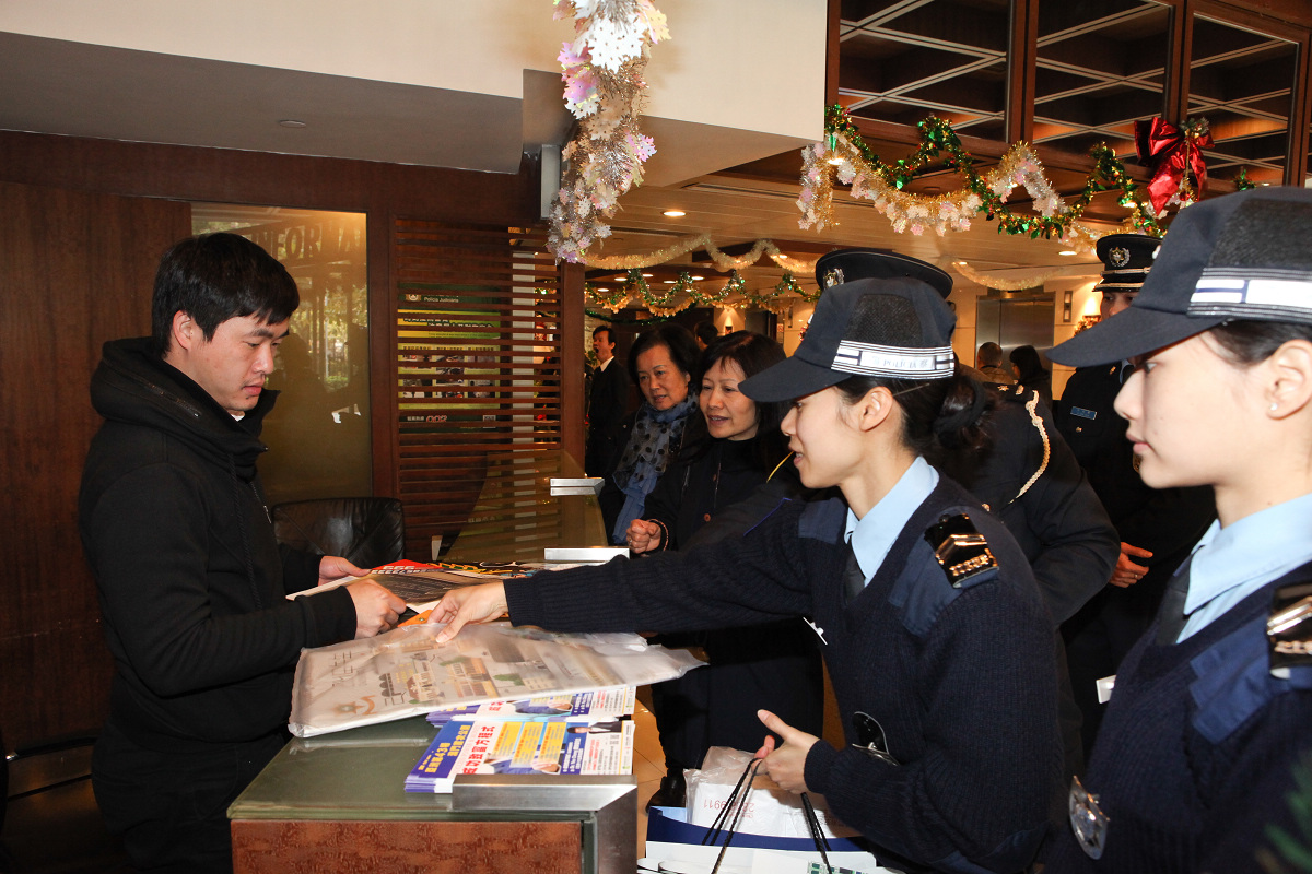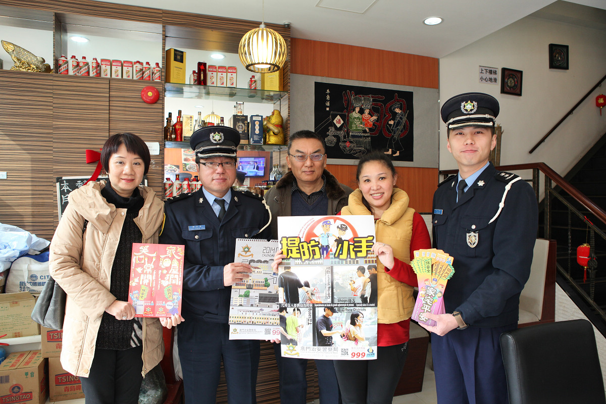 根據以往經驗,緊接新年前以及長假期出現的盜竊情況會較平時為嚴重,同時盜竊發生的原因往往由於自身防範薄弱;另外,市民駕車出行的情況亦會增多,交通安全尤須關注。為此治安警察局各單位連日來到澳門及離島各區住宅群、旅遊區等接觸管理員、店員、市民,派發 “慎門戶 保安全”、“提防小手”、 “交通安全”等宣傳單張,藉此提升意識,做好防範。