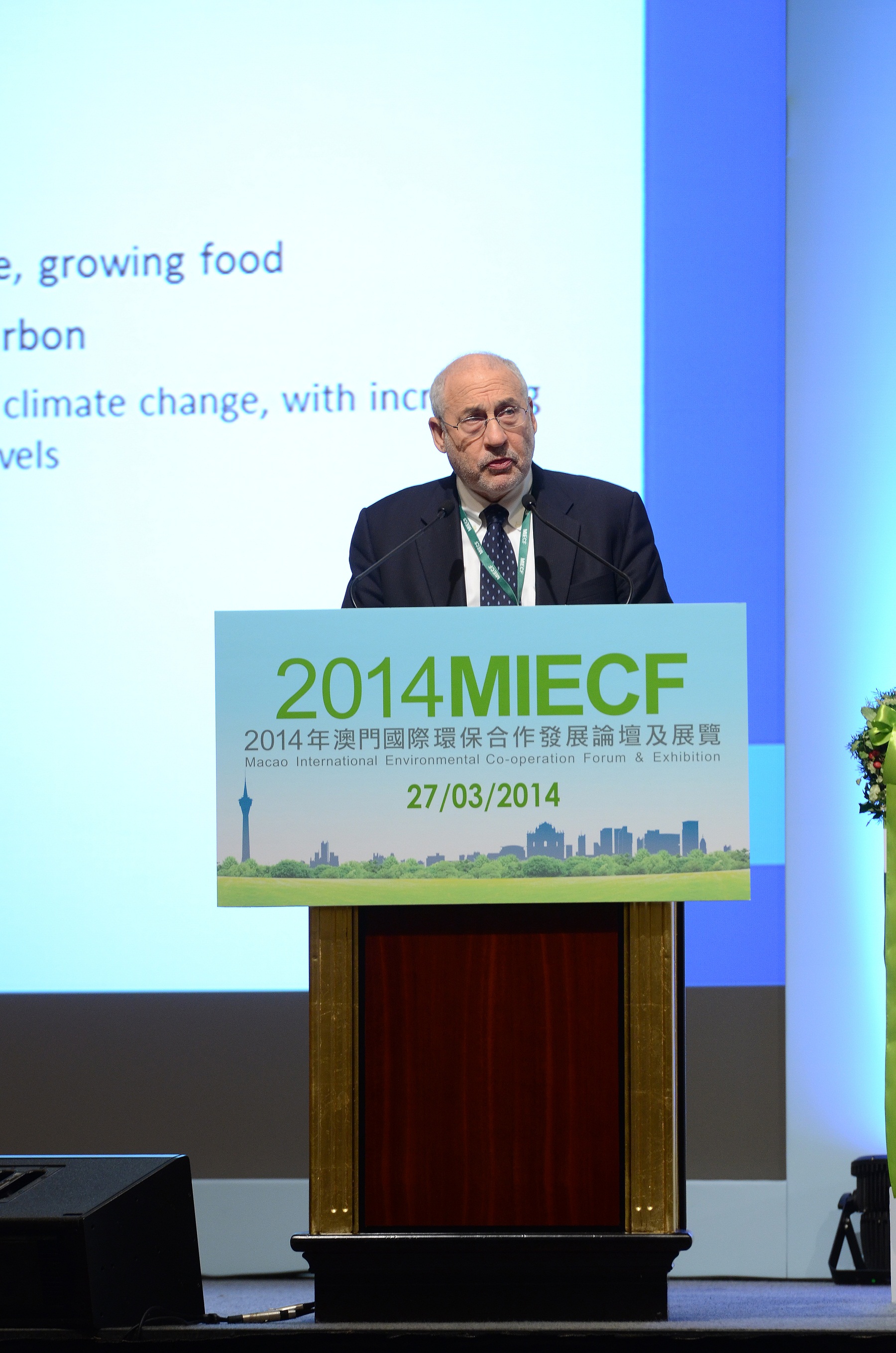 「2014年澳門國際環保合作發展論壇及展覽」(MIECF)薈萃合共9場精彩演講,集合來自世界各地的專家學者共同就環保議題發表真知灼見. 於今天的開幕禮上,大會邀請了諾貝爾經濟獎得主、世界銀行前首席經濟師、澳門大學榮譽社會科學博士、哥倫比亞大學斯蒂格利茨教授(Joseph Stiglitz)以「綠色未來共同成長:為什麼解決不平等是保護環境的關鍵」作專題演講。