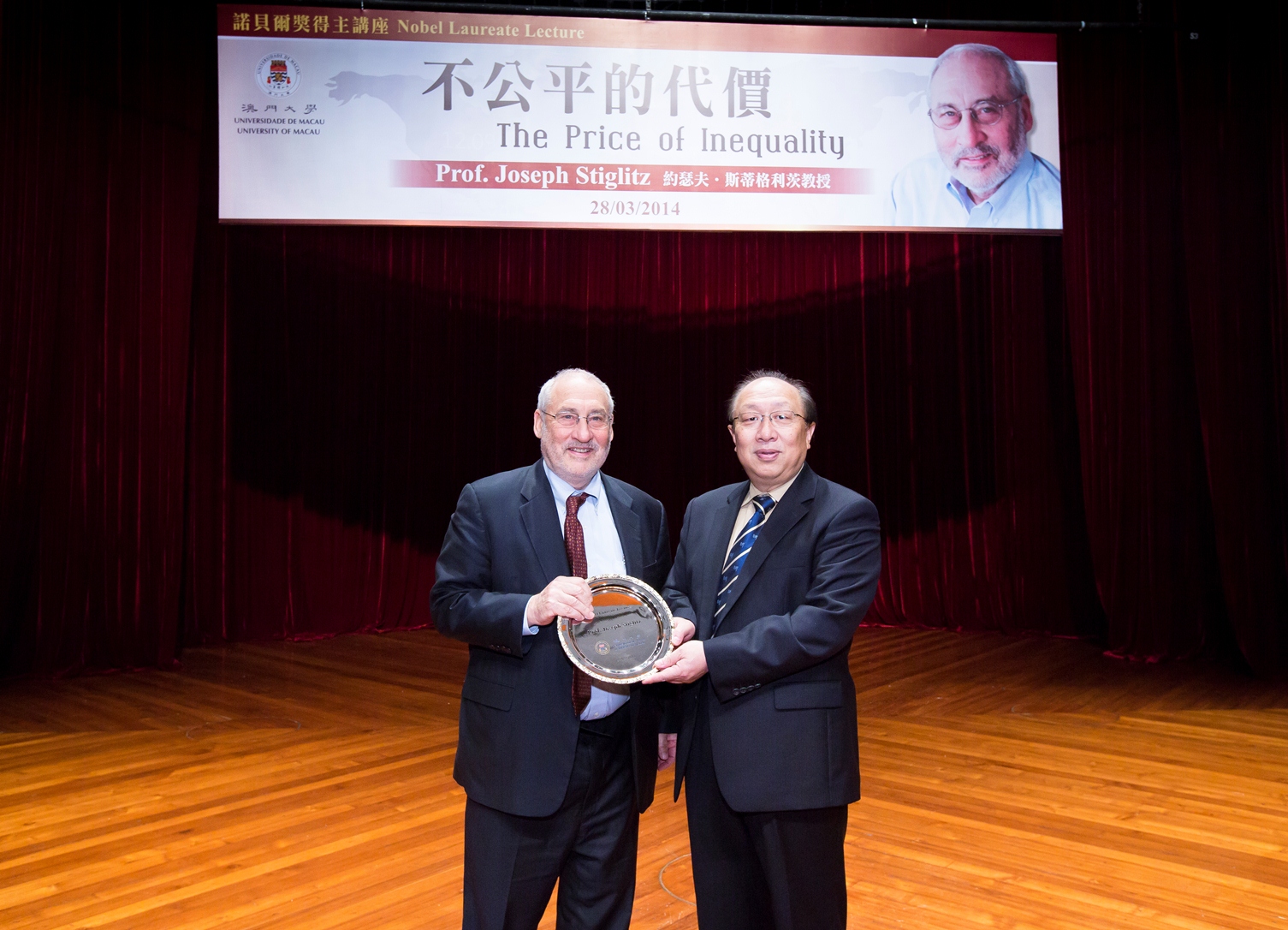 被譽為當代最重要的經濟學家之一、諾貝爾經濟學獎得主、澳大榮譽博士約瑟夫‧斯蒂格利茨教授(Prof. Joseph E. Stiglitz)今(廿八)日應邀到澳門大學主講“不公平的代價”,為本澳學生及公眾解讀現今社會不公平分配的各種現象。講座反應熱烈,現場座無虛席。