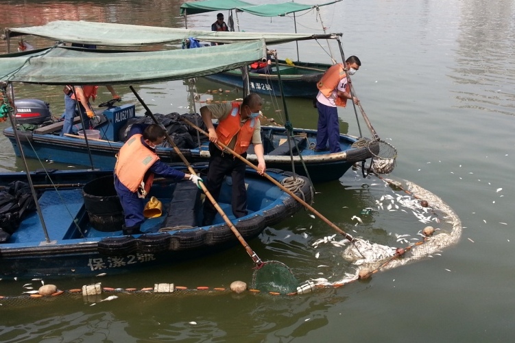 海事及水務局派出了五艘船隻在筷子基北灣和內港碼頭一帶海面清理死魚,致力爭取於今日內完成清理工作,令海面環境恢復清潔。海事及水務局呼籲市民不要撈取死魚食用,以免影響健康。