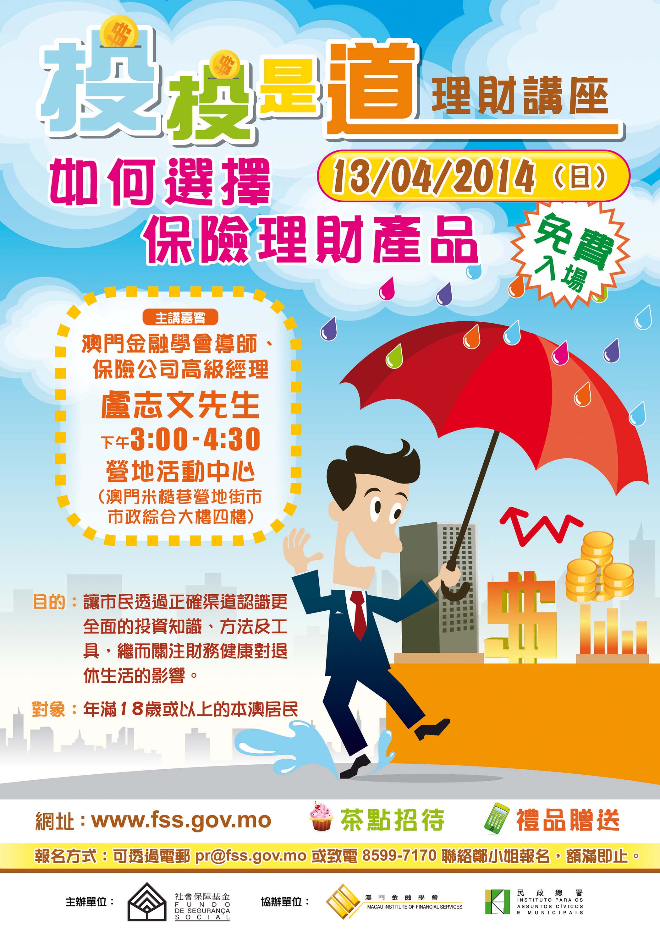 「投投是道」系列講座由社保基金主辦,民政總署及澳門金融學會協辦,目的是鼓勵市民學習基本的投資知識、方法及工具,並關注財務健康對退休生活的影響。有興趣的人士可於辦公時間致電85997170報名,或郵寄姓名、出席人數和聯絡電話至pr@fss.gov.mo。活動名額有限,額滿即止,詳情可瀏覽社保基金網頁www.fss.gov.mo。