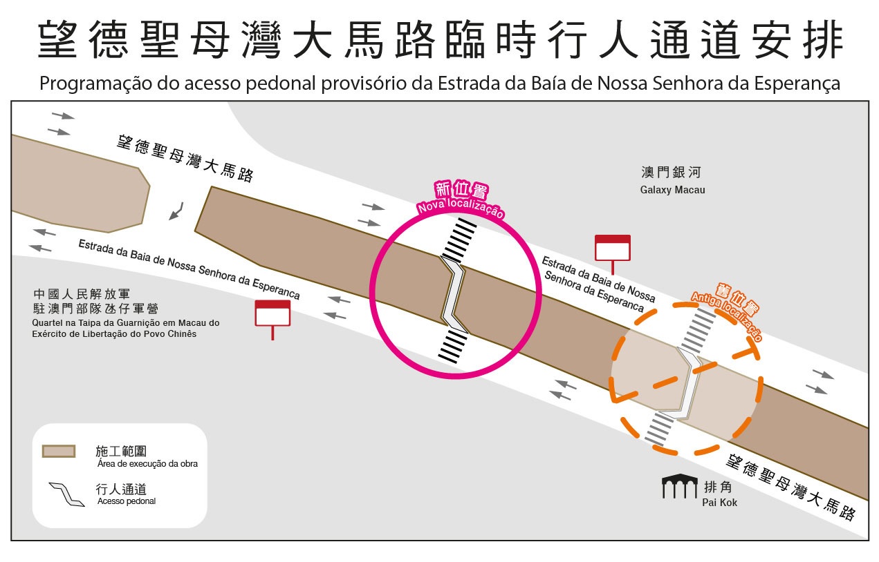 為配合輕軌氹仔線高架橋的施工,位於望德聖母灣大馬路近排角對出一段原有行人通道將向解放軍駐澳部隊軍營方向平移60米(詳見附圖)。新行人通道由即日起(10日)啟用,運輸基建辦公室及交通事務局呼籲市民留意現場交通安排及指示。