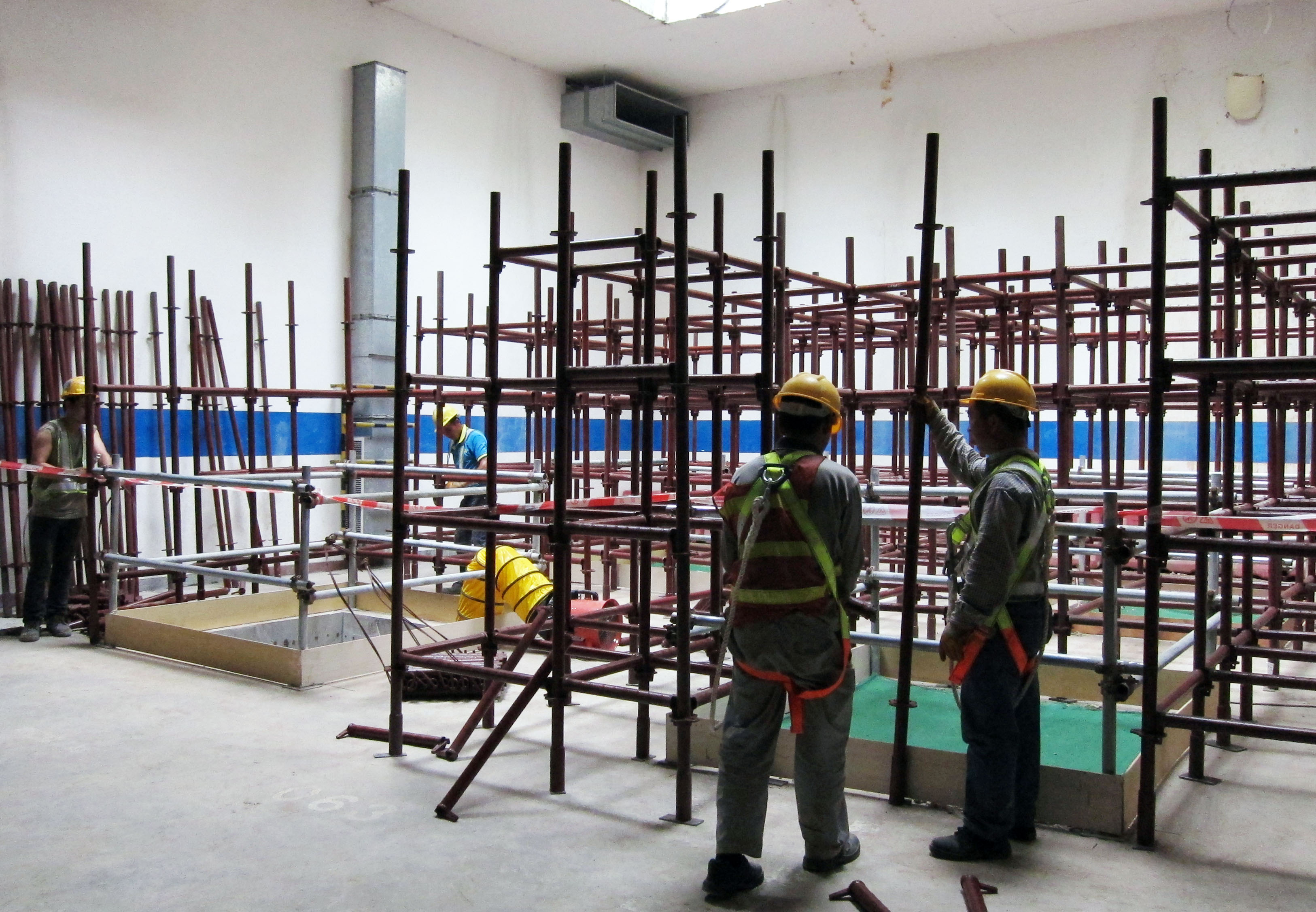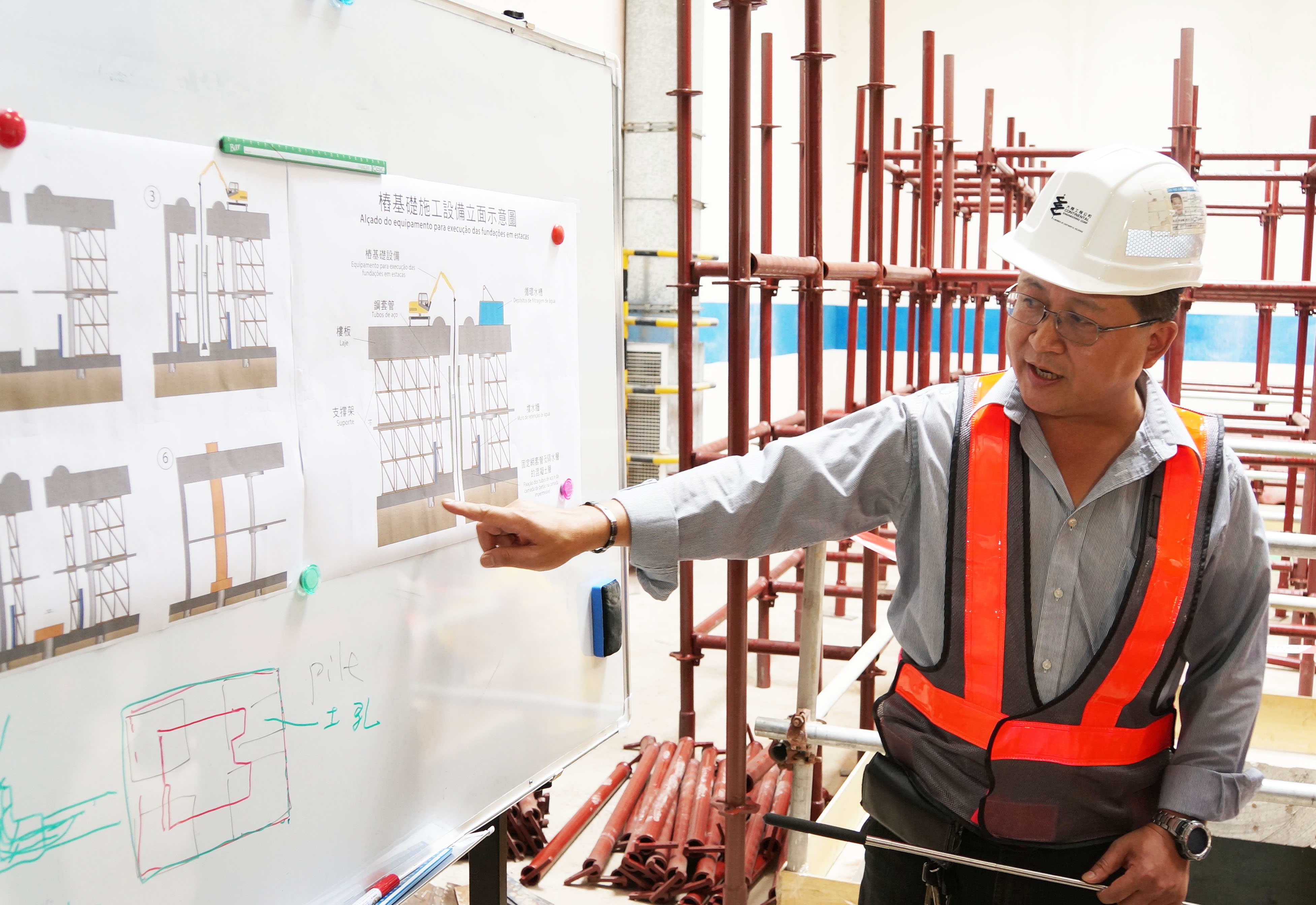 就有關技術問題,運輸基建辦公室積極與施工單位溝通協調,而施工單位亦因應實際環境擬定特殊的施工方法,以順利開展樁基礎工程。其中,施工單位透過於地下停車場加設支撐架提供穩固承托,讓樁機可設置於停車場上方,並穿過兩層停車場樓板開展樁基礎工程的鑽孔工序。另一方面,施工單位亦在鑽樁位置設置長鋼套管,並圍繞樁基礎施工範圍建造3米高的臨時擋水牆及佈置抽水系統,以應對施工過程中可能出現地下湧水的情況,令樁基礎工程可安全和順利地開展。