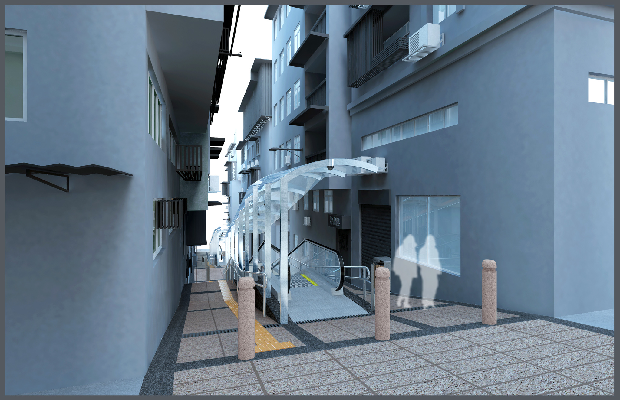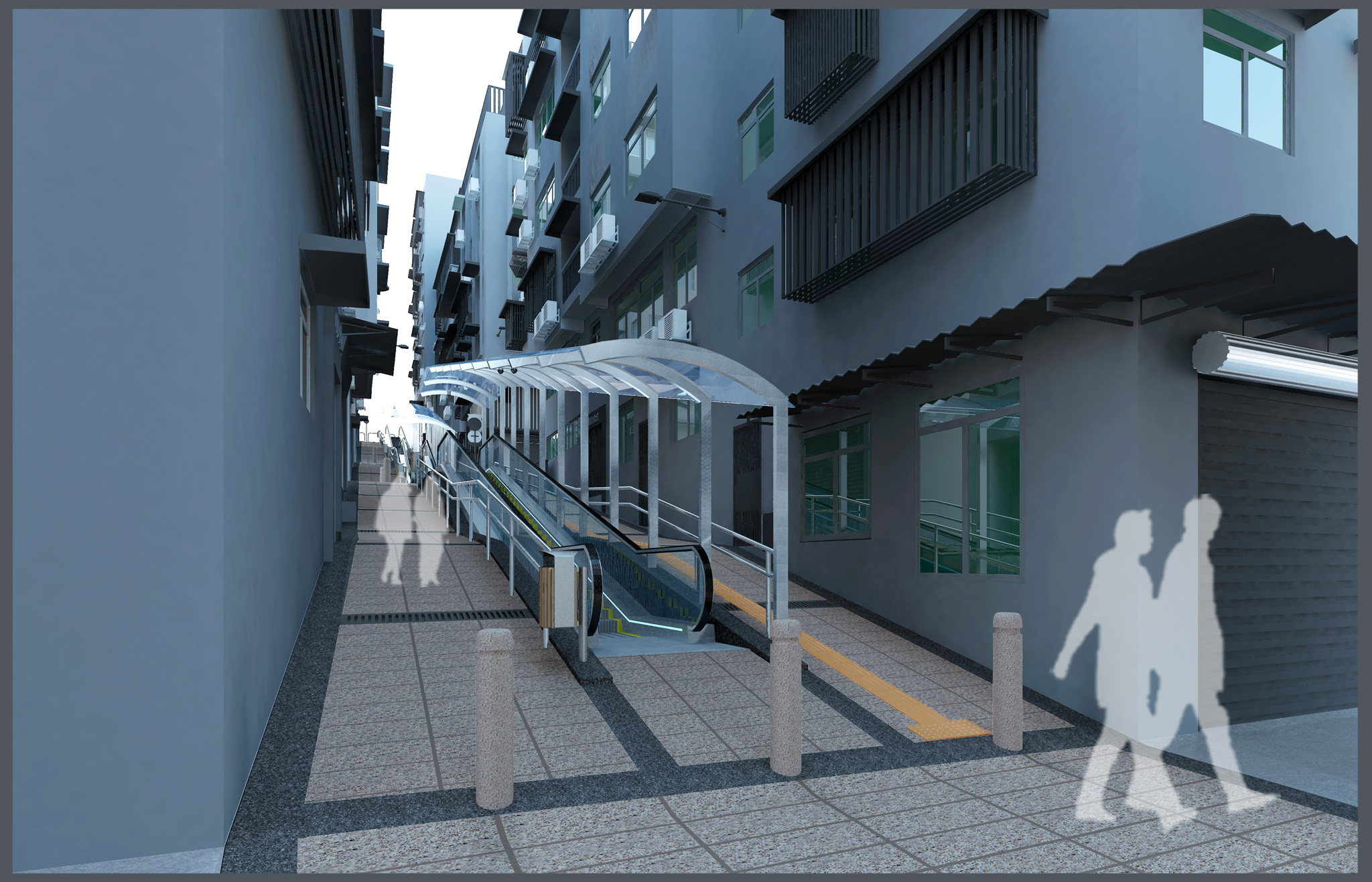 在系統設計上,愕街自動扶梯會與周邊環境協調,建造時亦會美化街道環境,包括鋪設防滑地磚等。考慮到兩旁有住宅大廈,自動扶梯的頂蓋會採用圓拱形設計及使用輕質材料,觀感上較輕巧又能做到不可承托成人重量,以防有人攀上頂蓋,起到保障居民人身及財產安全作用之餘,也不會阻礙消防救援。