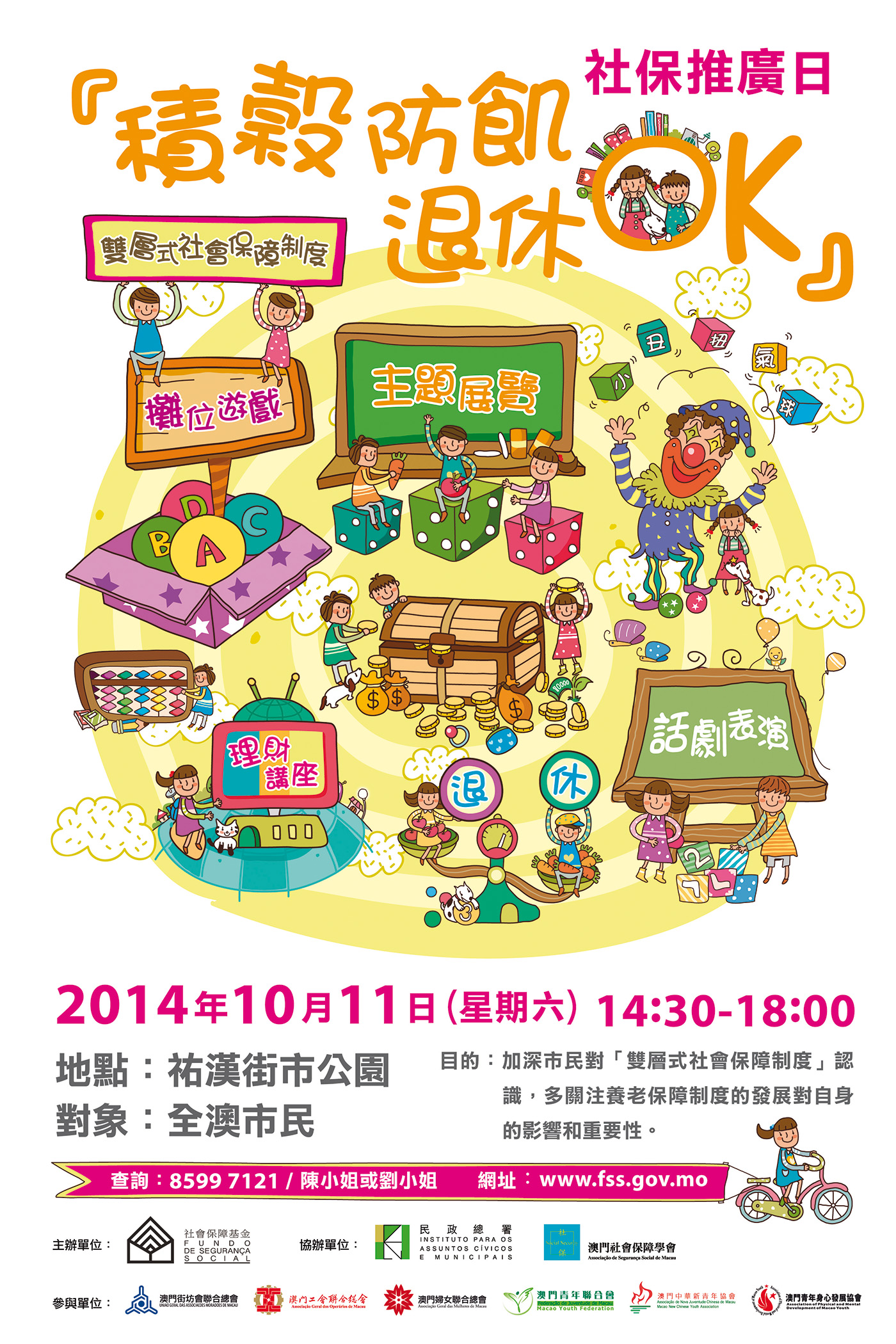由社會保障基金主辦、民政總署及澳門社會保障學會協辦的「『積穀防飢 退休OK』社保推廣日」將於本周六(11日)下午2時半至6時假祐漢街市公園舉行,現場設有攤位遊戲、主題展覽、話劇表演和理財講座等,主辦單位希望透過豐富的節目內容加深市民對雙層式社會保障制度的認識,以及推廣妥善理財以安享退休生活的重要性。