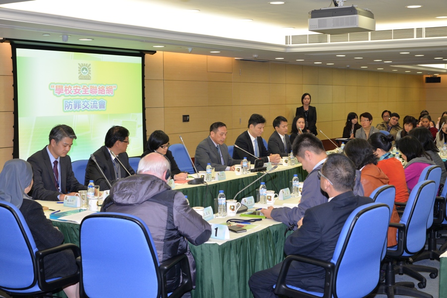 為進一步深化警校合作和交流,共同預防青少年犯罪及提升青少年的防罪意識,司法警察局於1月8日下午在總部大樓舉辦“學校安全聯絡網防罪交流會”,教育暨青年局教育心理輔導暨特殊教育中心主任周佩玲、澳門中華教育會會長何少金、澳門中華學生聯合總會主席劉嘉翀及67所學校校長或代表合共115人應邀出席,與司警局局長周偉光、副局長杜淑森、司法警察學校代校長黃志康、毒品罪案調查處處長余光輝、資訊罪案調查處處長蘇兆強、社區警務及公共關係處處長鄭寶湘及關注少年組職務主管朱惠敏等就促進警校合作及加強青少年防罪教育的議題進行探討和交流。