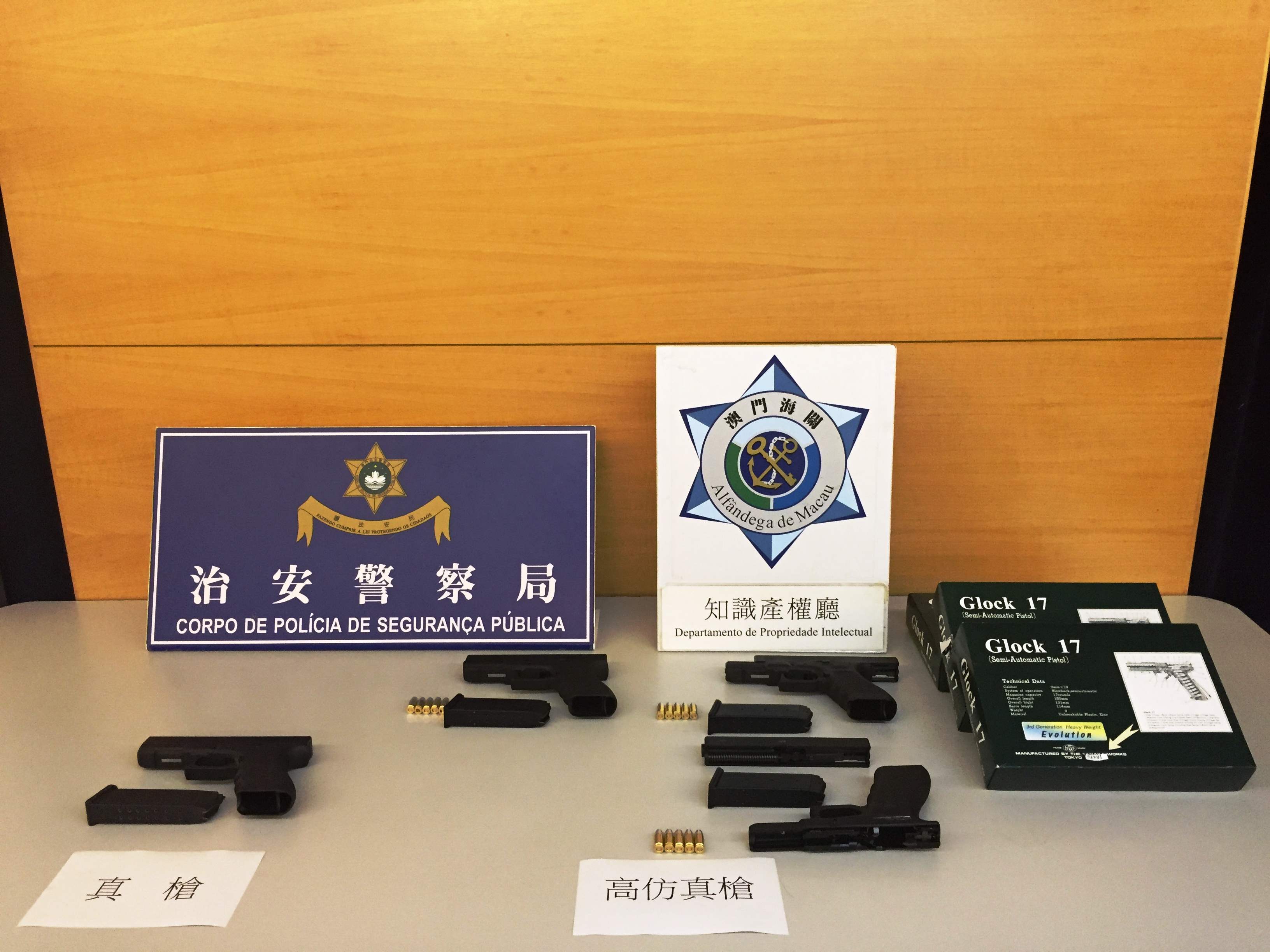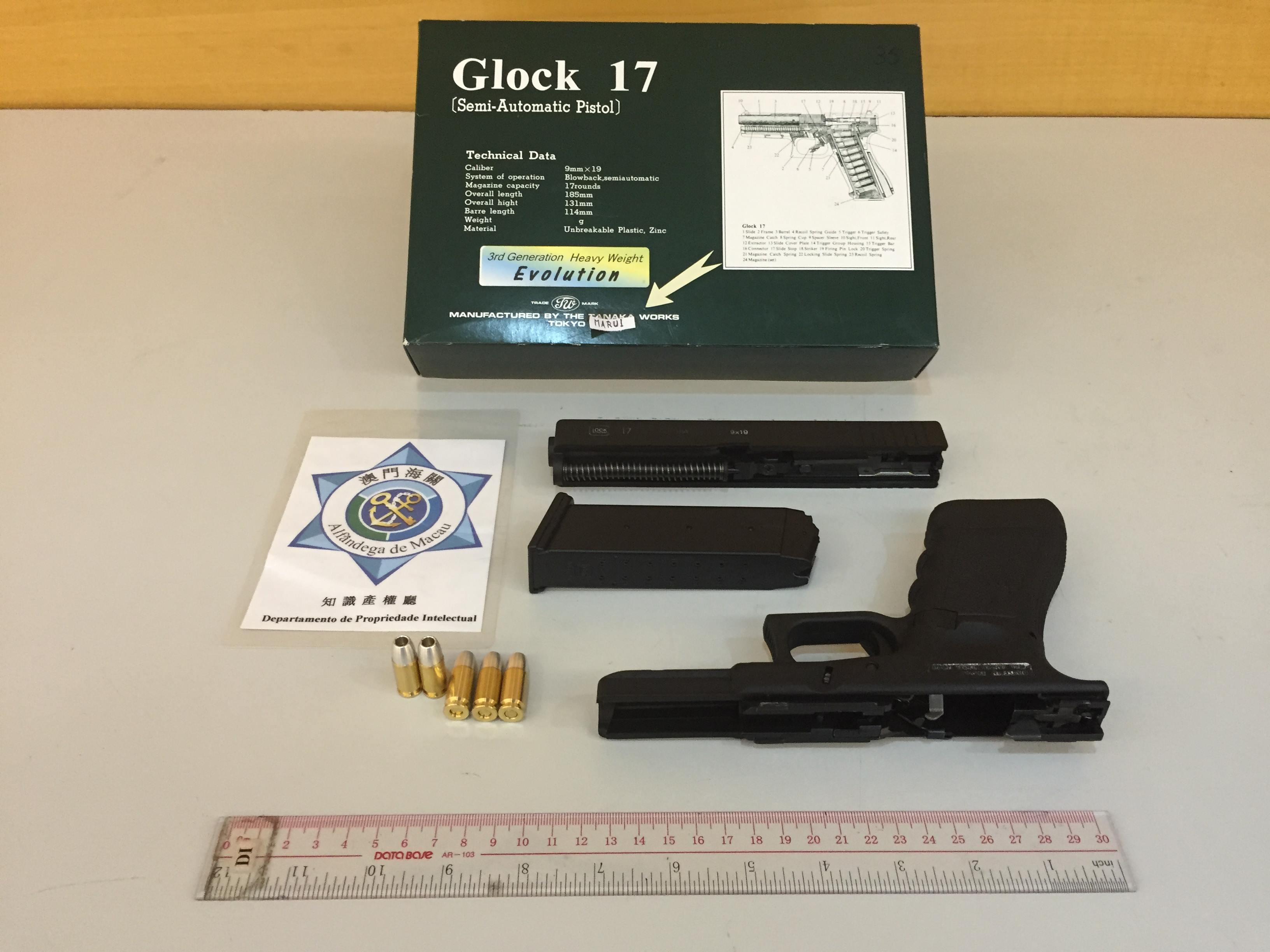 在治安警察局情報廳槍械暨彈藥科將一批仿真槍交予海關跟進後,海關就上述案件迅速展開跟蹤及調查,涉案包括四十多種不同型號的仿真槍械共八十一支,其中包括:仿真長氣槍三十一支,報稱仿真短氣槍五十支,但當中三支「GLOCK 17」短手槍,包裝盒上生產商號名稱為「TANAKA」,卻被人用白色貼紙遮蓋,貼紙寫上「MARUI」的字樣,以符合申請進口准照內描述;同時說明書被故意用黑色膠袋包裹,有充份證據顯示涉案人魚目混珠,企圖蒙騙海關和治安警察局人員檢查。