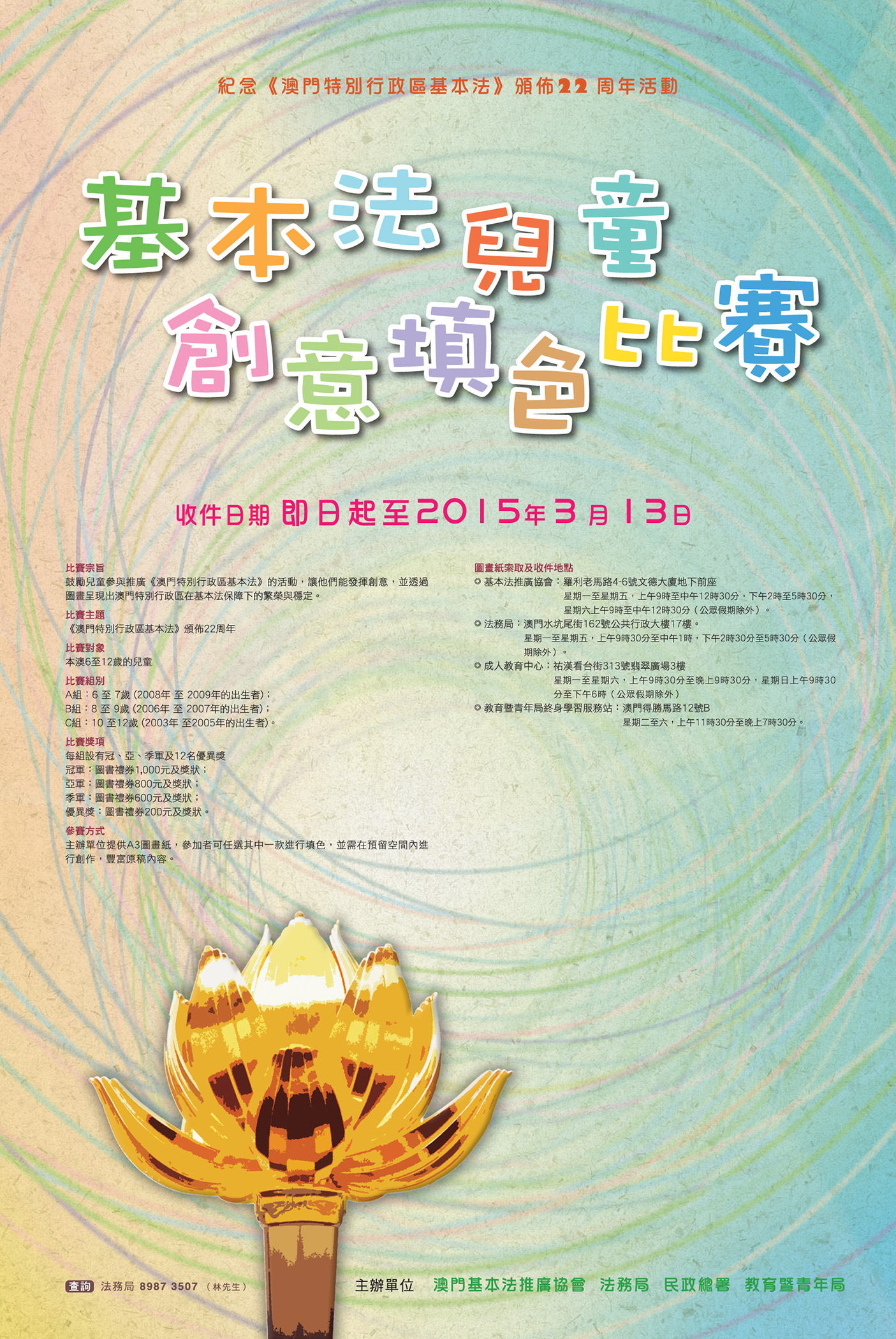為紀念《澳門特別行政區基本法》頒佈二十二周年,澳門基本法推廣協會、法務局、民政總署和教育暨青年局將共同舉辦一系列慶祝活動,而其中的基本法兒童創意填色比賽現已開始接受報名。