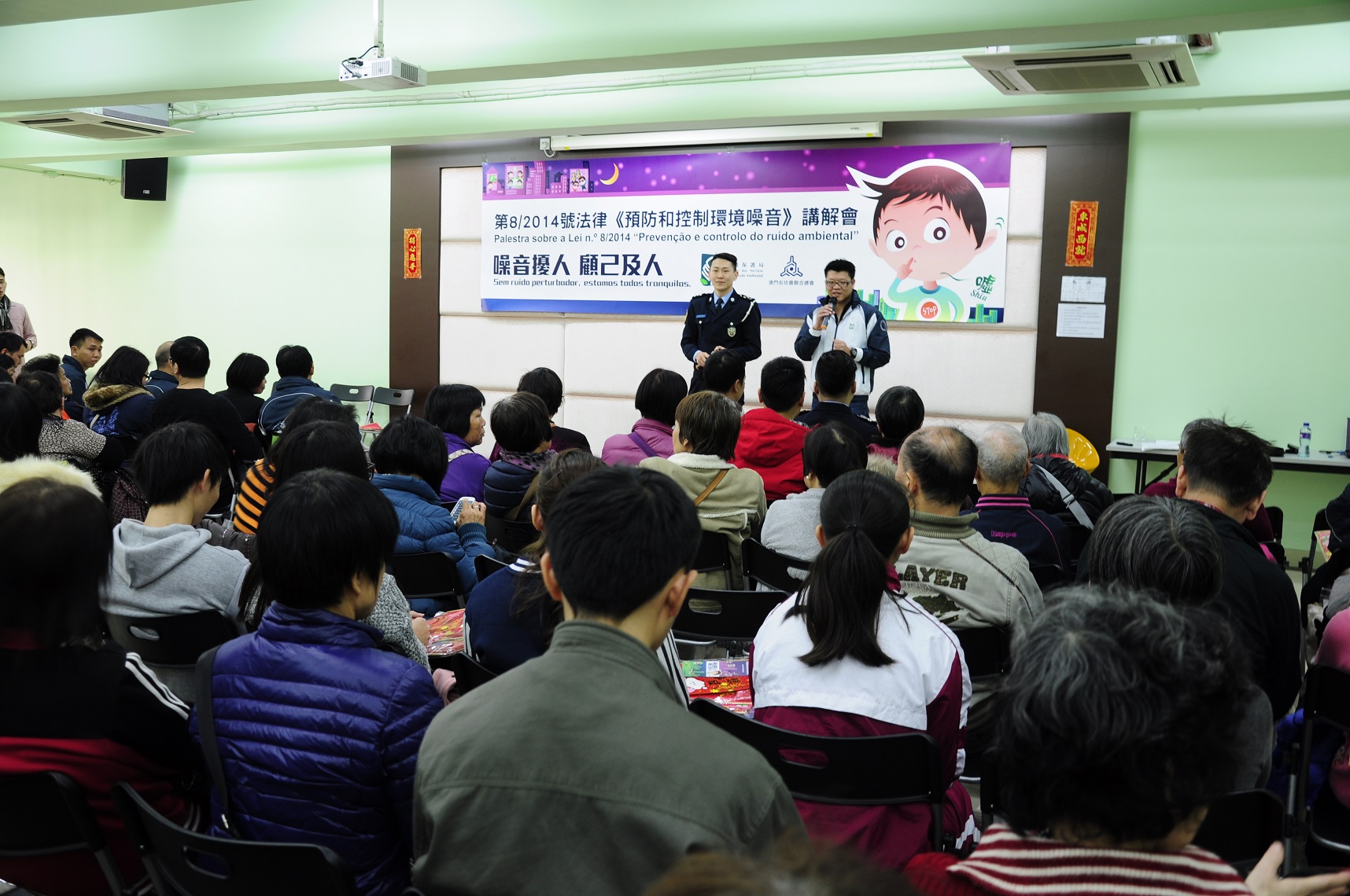 為向市民宣揚“噪音擾人,顧己及人”的訊息,環境保護局與澳門街坊會聯合總會於今日下午舉辦了《預防和控制環境噪音》法律社區普法活動,環保局人員以及一眾義工落區宣傳,包括到大廈和商舖派發宣傳單張及張貼海報,向市民及商戶宣揚減少製造噪音的環保意識。此外,下午亦舉辦了社區講解會,分別由環境保護局及治安警察局代表講解新噪音法的相關管制內容,以及和市民交流有關意見。