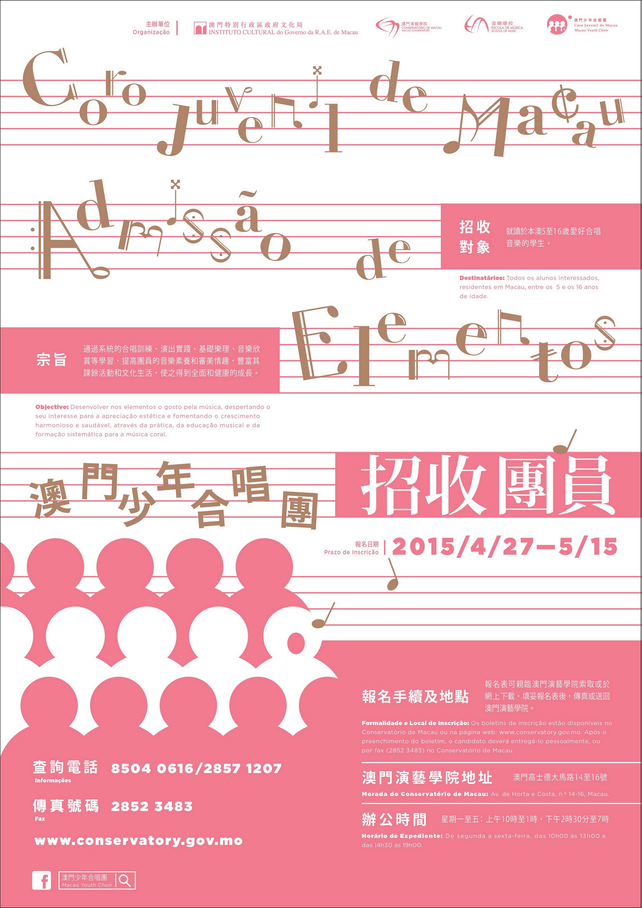 文化局澳門演藝學院澳門少年合唱團由即日起至五月十五日進行團員招募,對象為五至十六歲的學生,歡迎有興趣青少年報名參加。