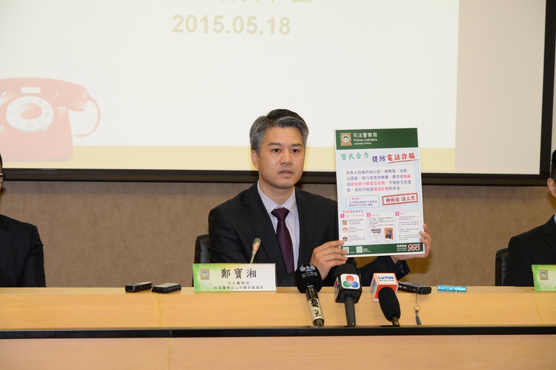 5月18日下午,司警局於總部大樓舉行新聞發佈會,公佈司警局接獲的電信詐騙案立案數字,並講解詐騙案例和行騙手法的演變。為進一步加強市民的防罪意識和警民合作意識,司警局因應新出現的假冒內地機關工作人員的電信詐騙手法,製作新的宣傳短片,連同過往的防罪宣傳短片,錄製成“司警防罪短片集”光碟。於發佈會上,司警局將首批光碟贈送予各位傳媒、澳門街坊會聯合總會、澳門工會聯合總會、澳門婦女聯合總會、澳門物業管理業商會和民眾建澳聯盟等社團機構,冀能通過各社團機構將防罪資訊向社區廣泛傳播。此外,司警局還將進行一系列的防罪宣傳活動,包括: