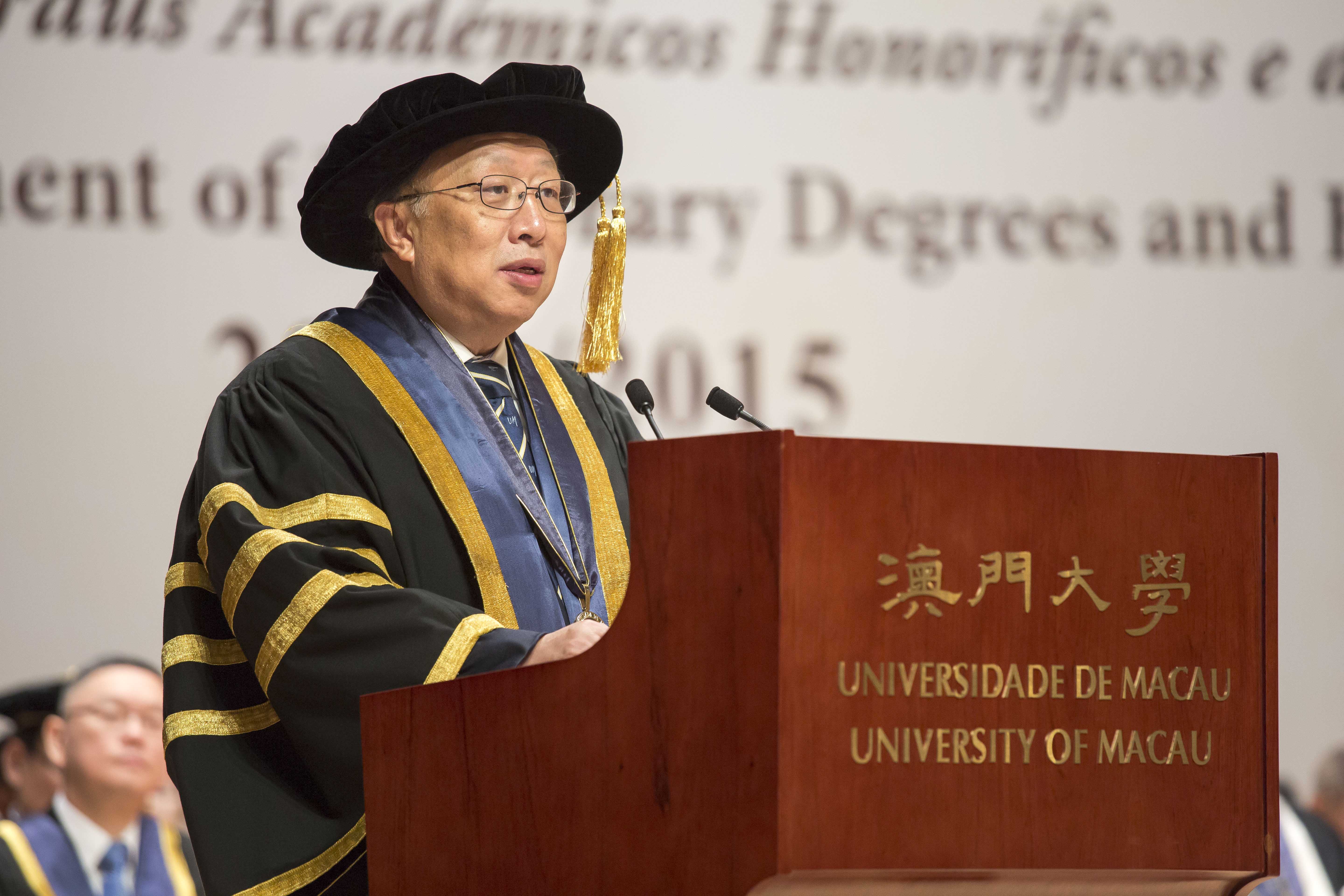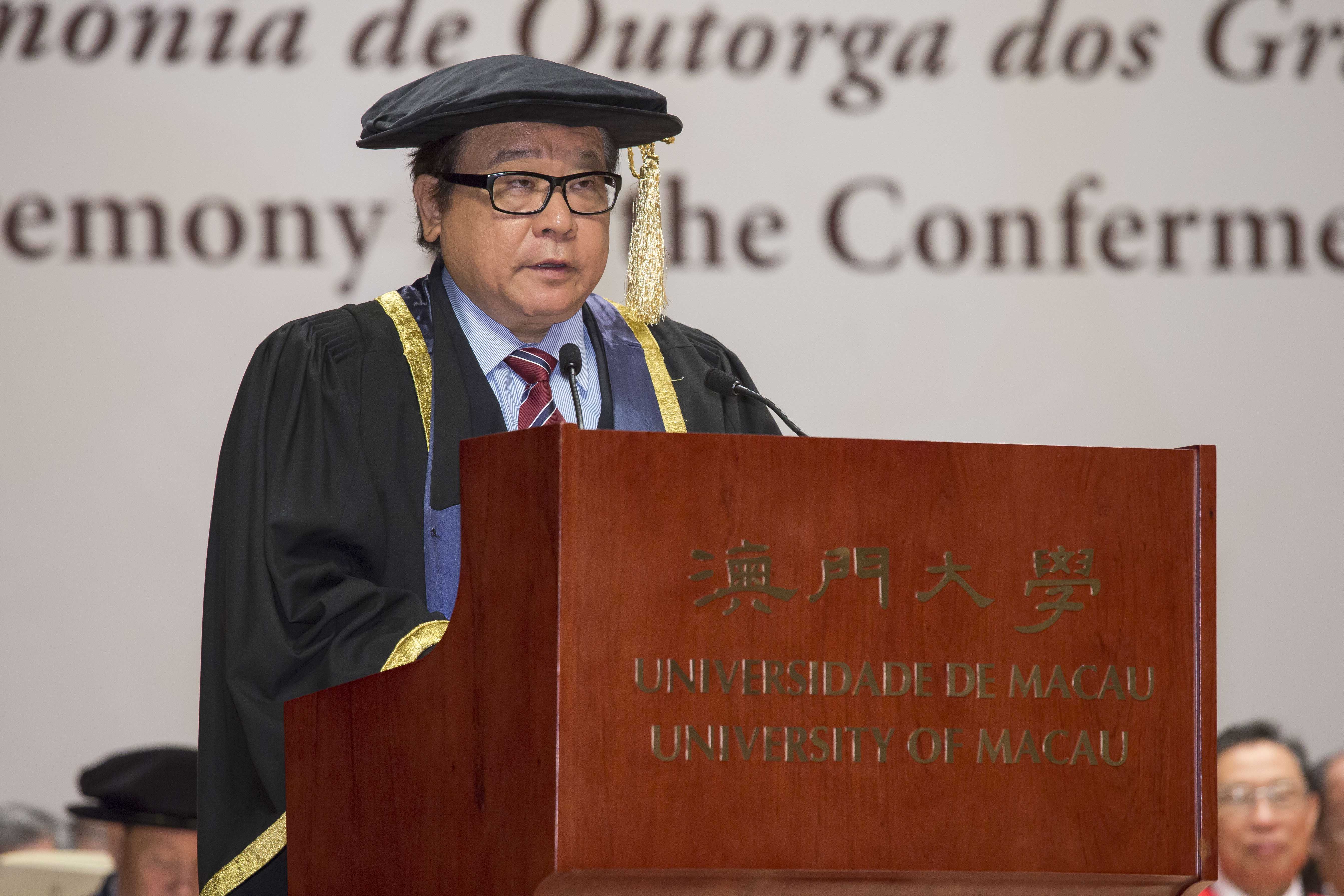 澳大校監代表、澳門特區社會文化司司長譚俊榮博士致辭時表示,希望畢業生珍惜在研究生階段的學習和研究經驗,以優異的成績回報家庭、學校和社會的培養和支持,做一個於社會有用的人,實現自身的人生價值和社會價值。