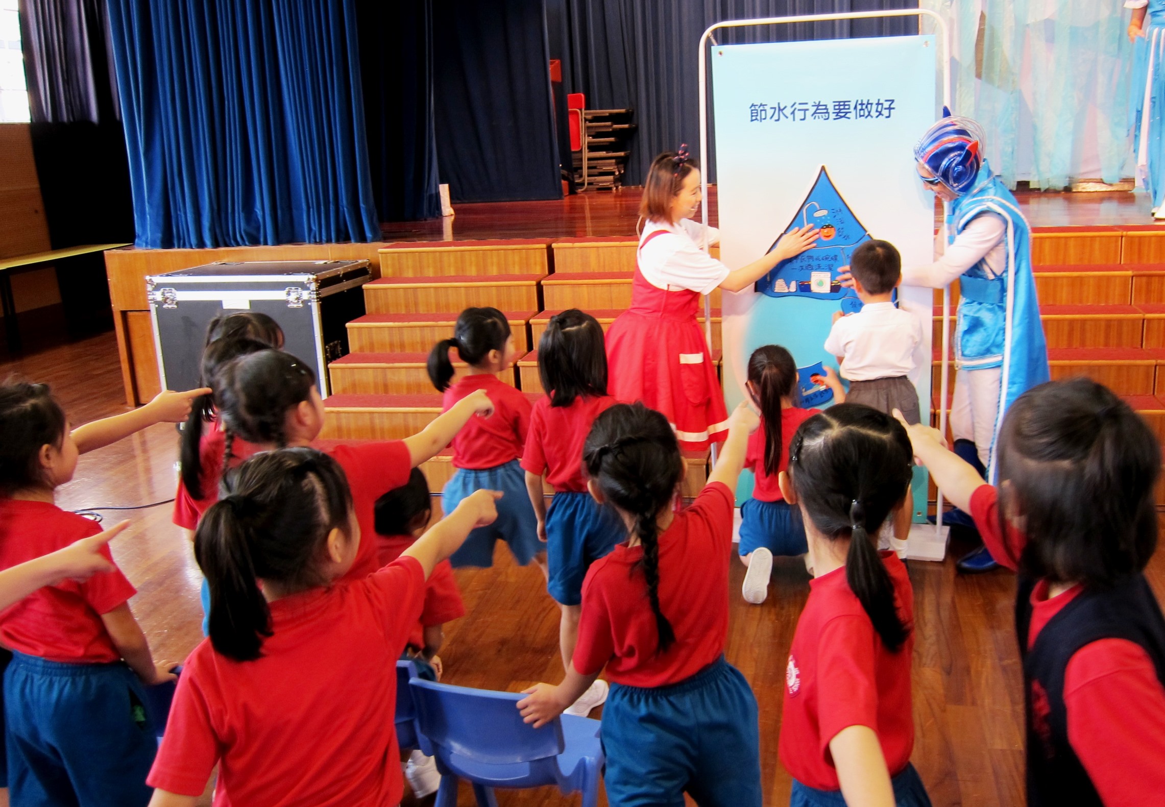 為使節水意識全面普及,海事及水務局致力向社會各界宣傳節水,亦重點開展了多項校園節水教育工作。校園宣傳旨在培養孩子從小珍惜用水的習慣和價值觀,海事及水務局今年10月起更推出了校園節水宣傳劇《威水超人》,透過有趣互動的兒童話劇,教育初小學生日常生活節水的好方法及重要性。宣傳劇《威水超人》現正進行得如火如荼,至今已走訪19間學校,為約3,400位初小學生帶來精彩的演出,廣獲學校好評,節水宣傳效果顯著。